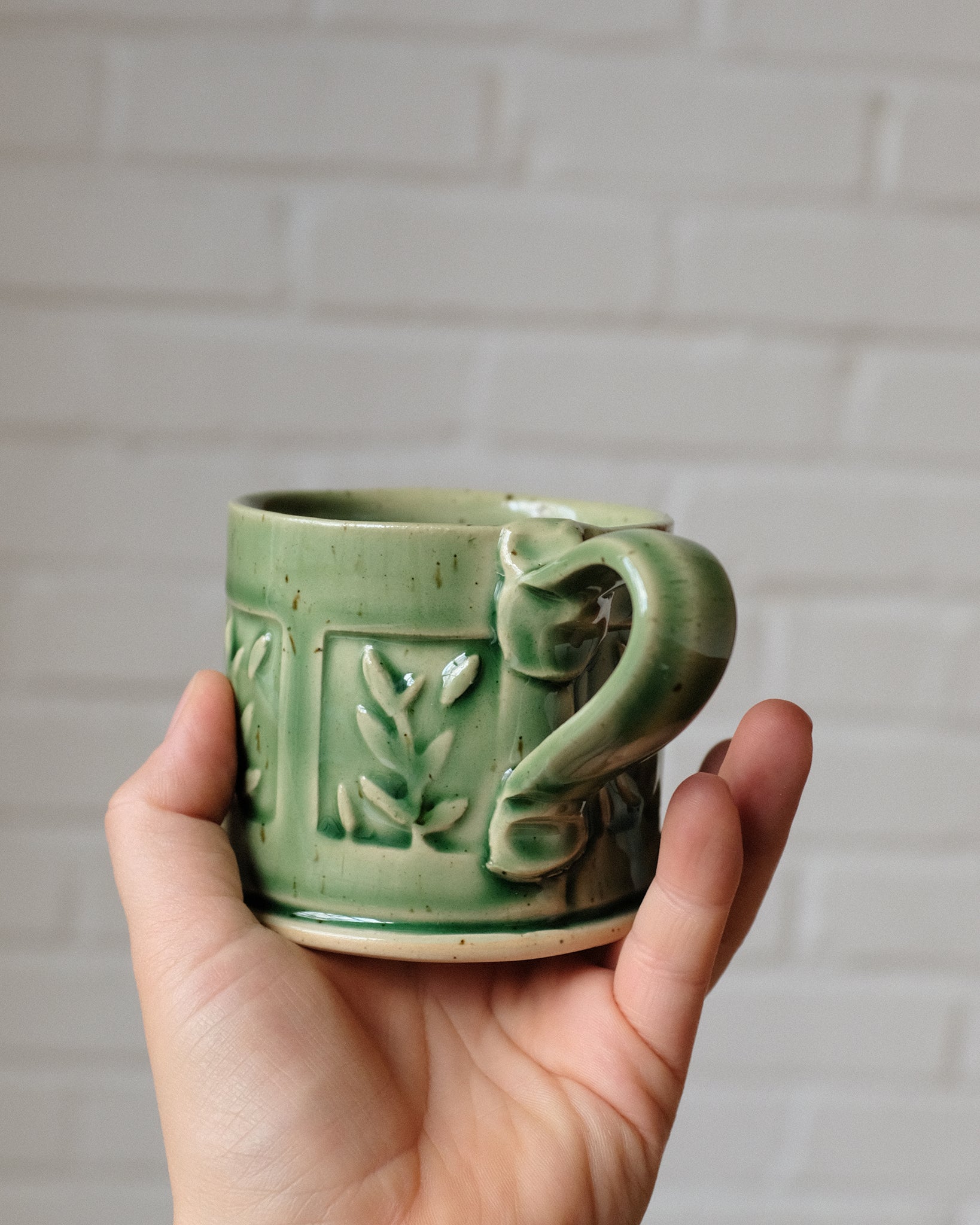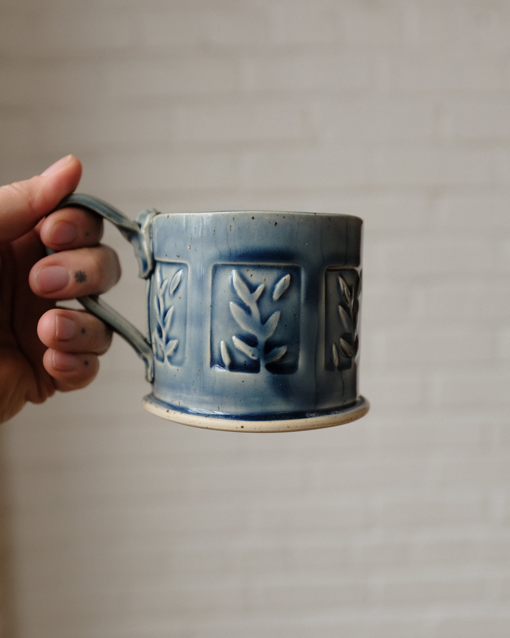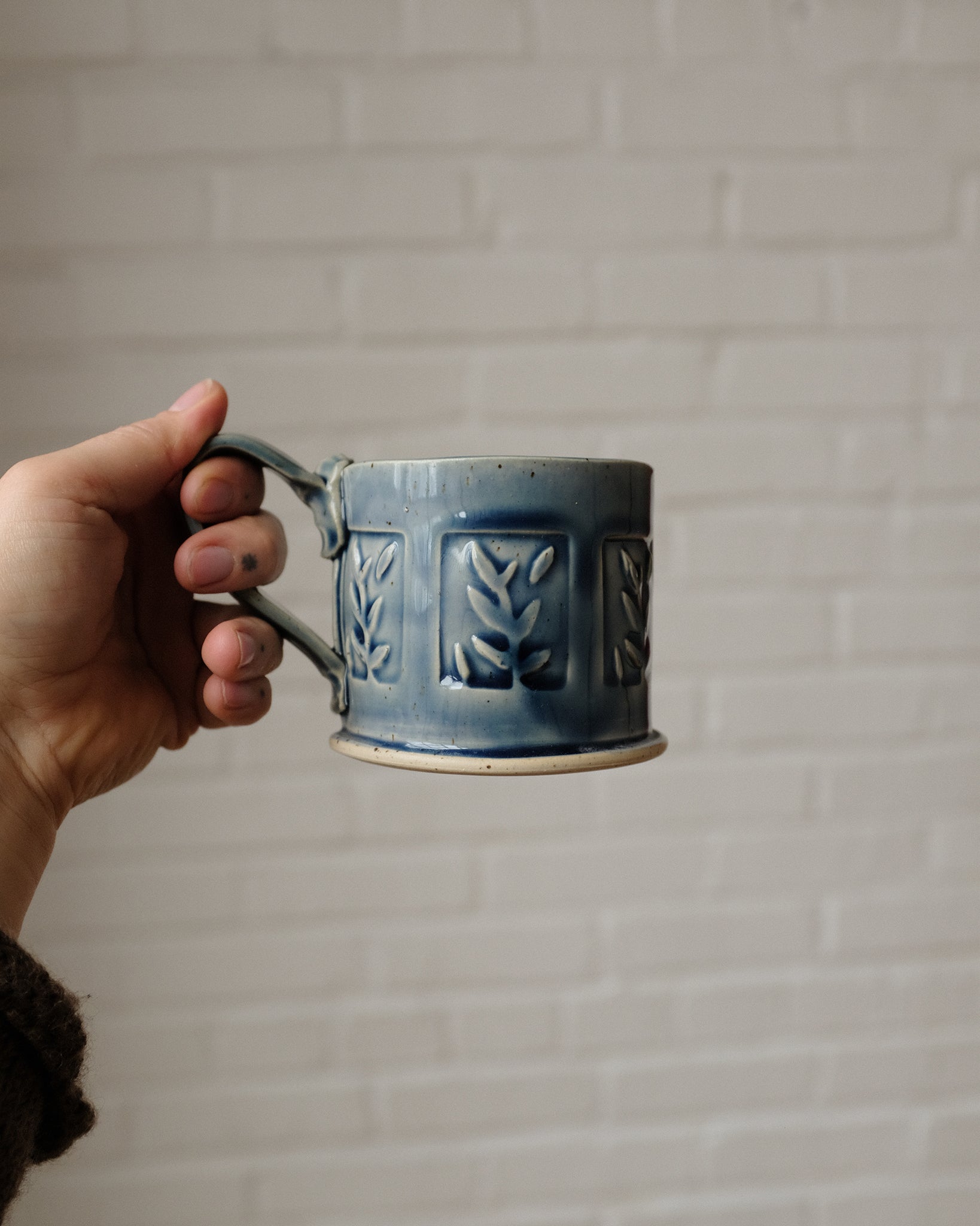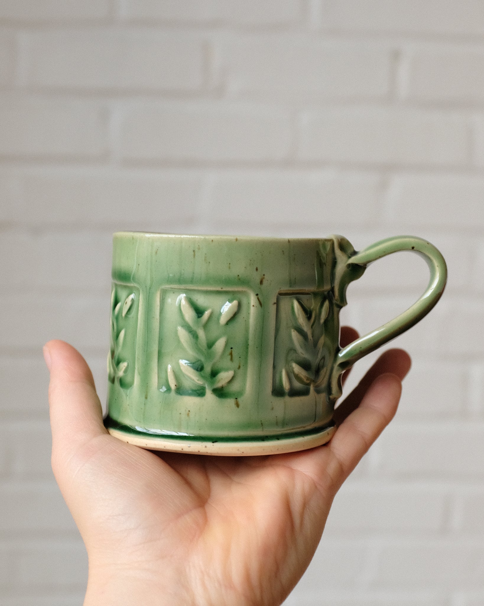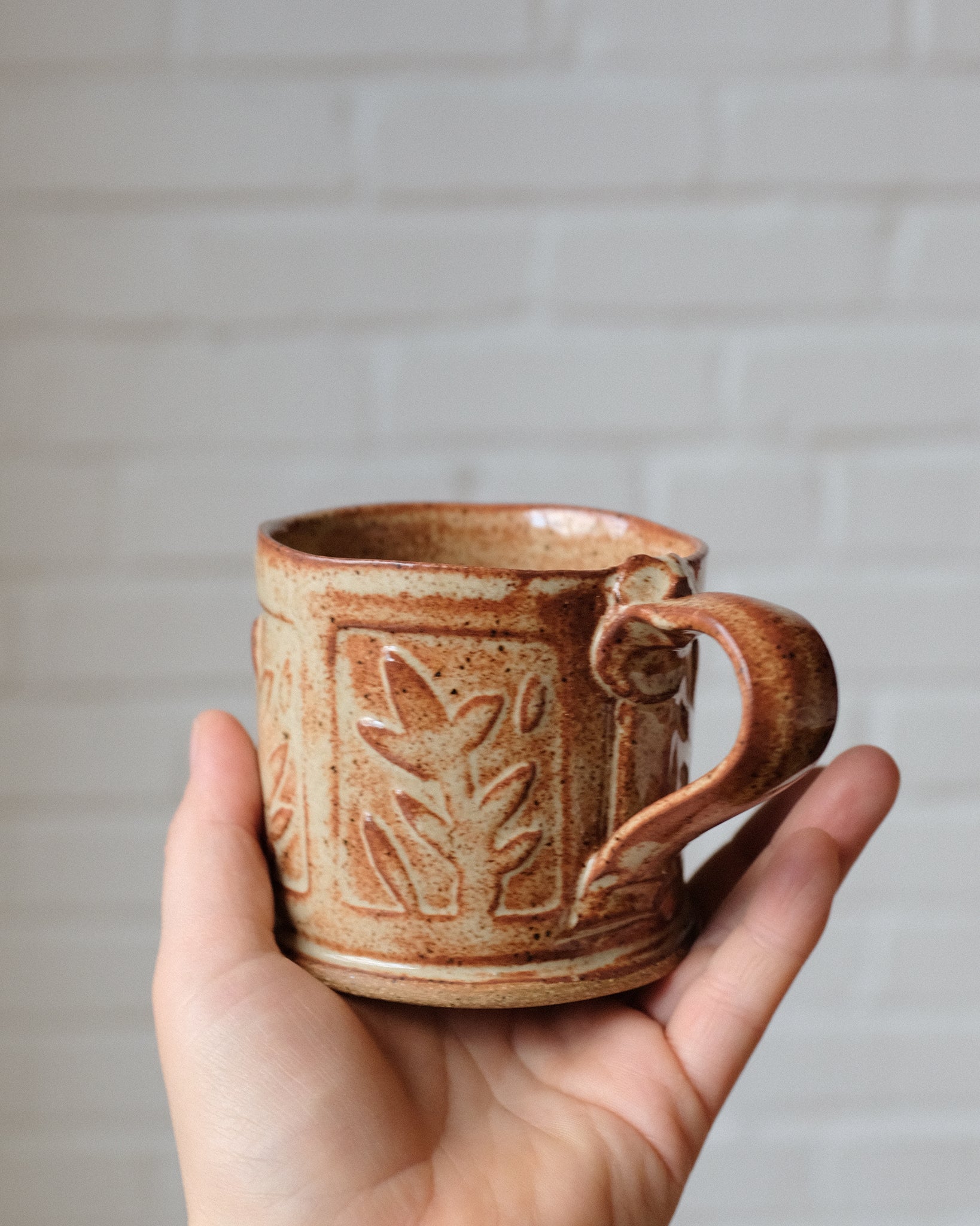 Mug made from a rolled out slab of clay, cut and stamped with hand-carved clay stamps. Glazed with a glaze that pools in the grooves of the stamped areas to accentuate the details.