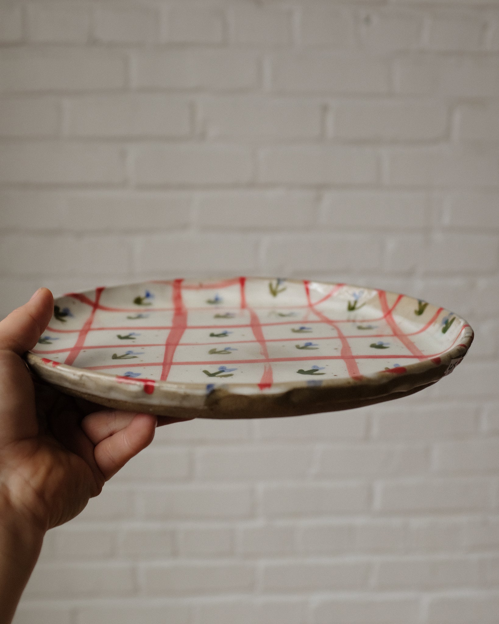 Assiette fait à la main, avec plaque d'argile. Décorer avec une engobe blanche, puis peint à la main avec un motif qui rappelle une nappe de pic nic.