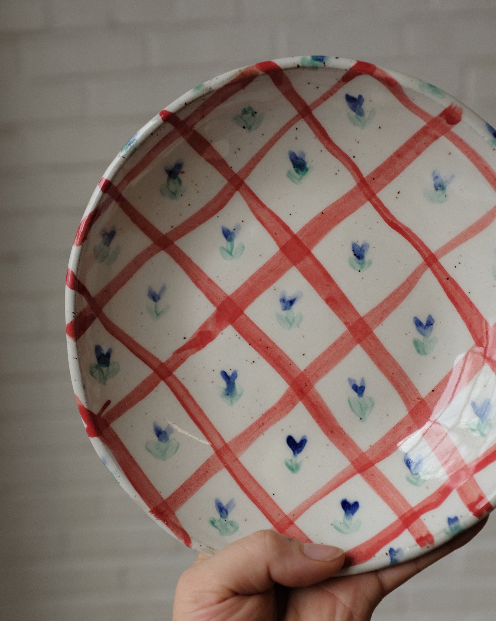 Each bowl is handmade from a brown speckled stoneware clay. Made from a rolled out slab of clay, it is draped over a bisque mold I made for this purpose. Smoothed and shaped and then trimmed. After the first bisque firing I apply a bisque slip and then handpaint the motifs that are reminiscent of a table cloth you would place down on the grass in the park to have a picnic, or maybe curtains hanging in your grandma's kitchen <3