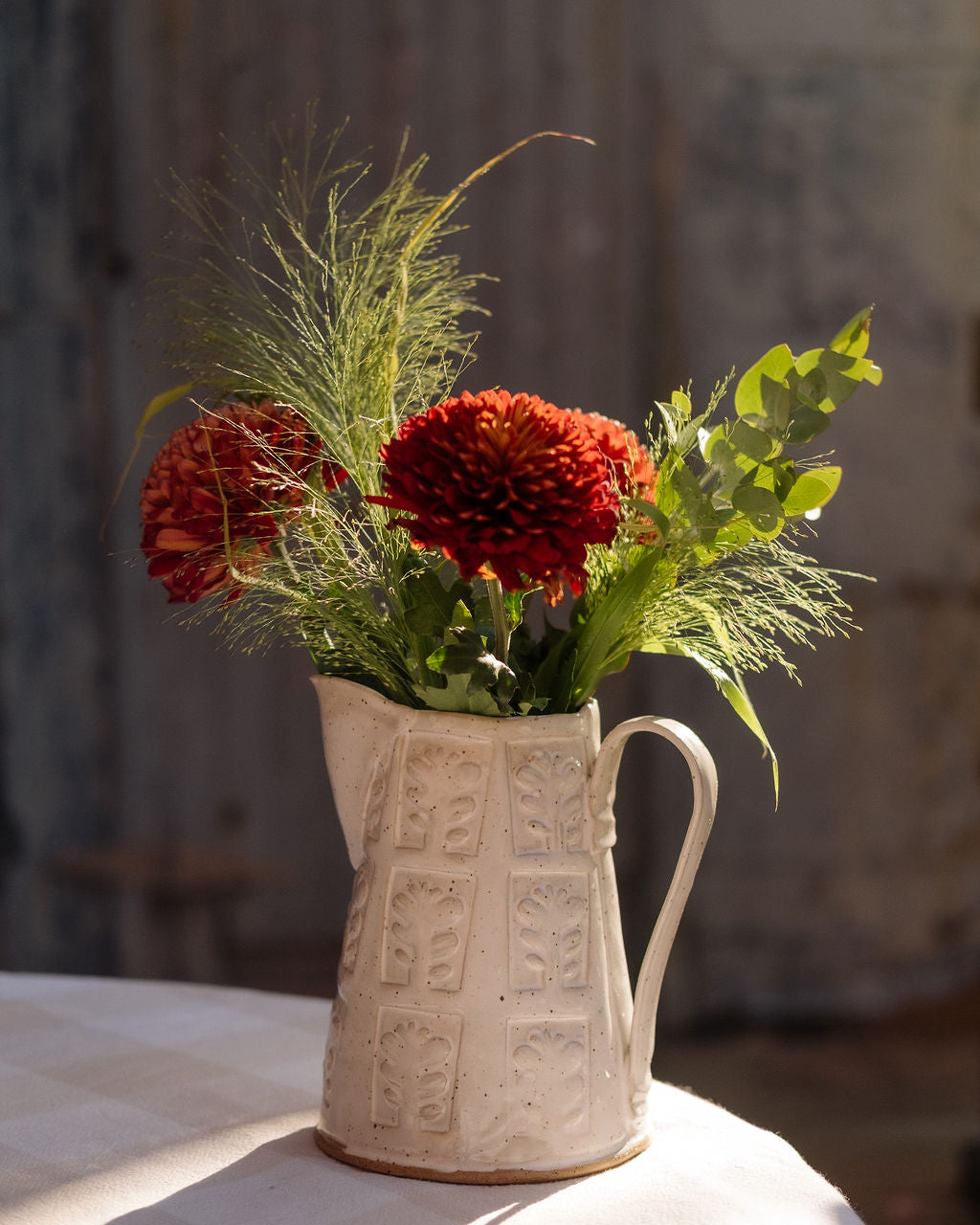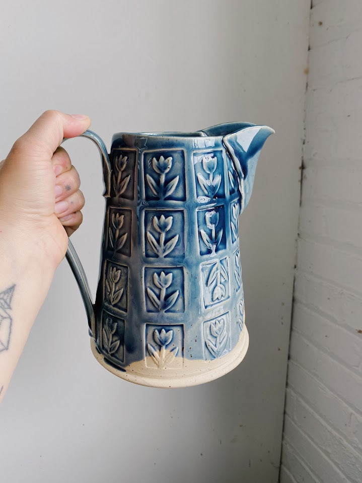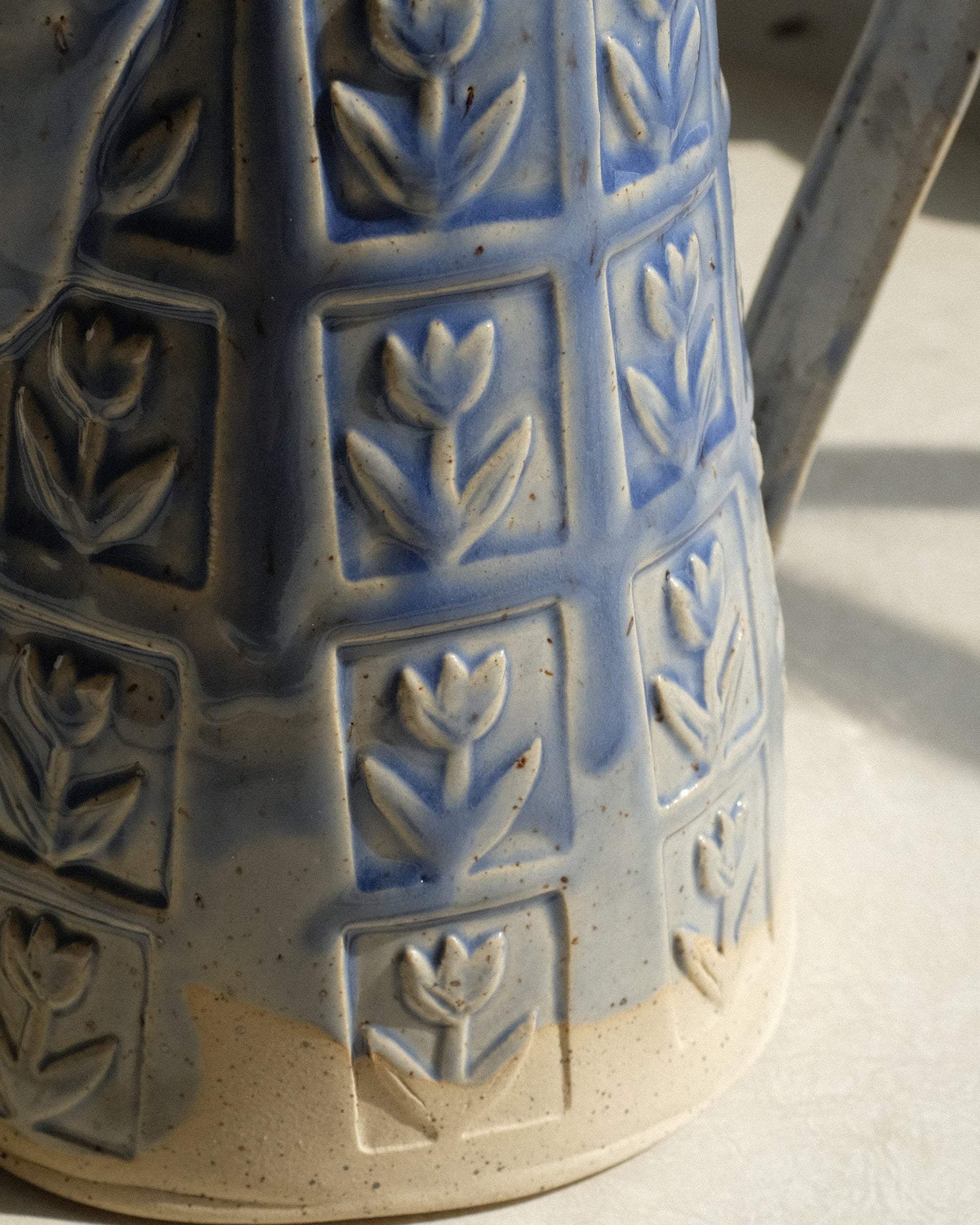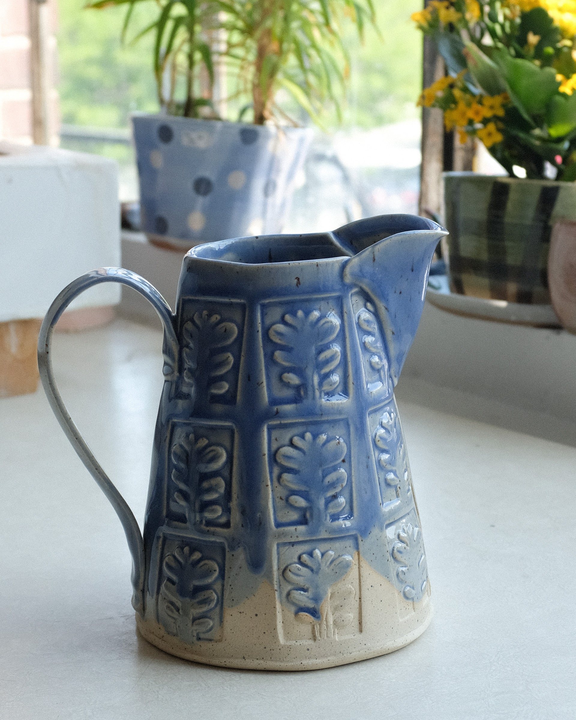 Pichet fabriqué à partir d'une plaque d'argile déroulée, découpée et estampée à l'aide de tampons en argile sculptés à la main. Émaillé avec un vernis translucide brillant qui se dépose dans les rainures des zones estampées pour accentuer les détails.