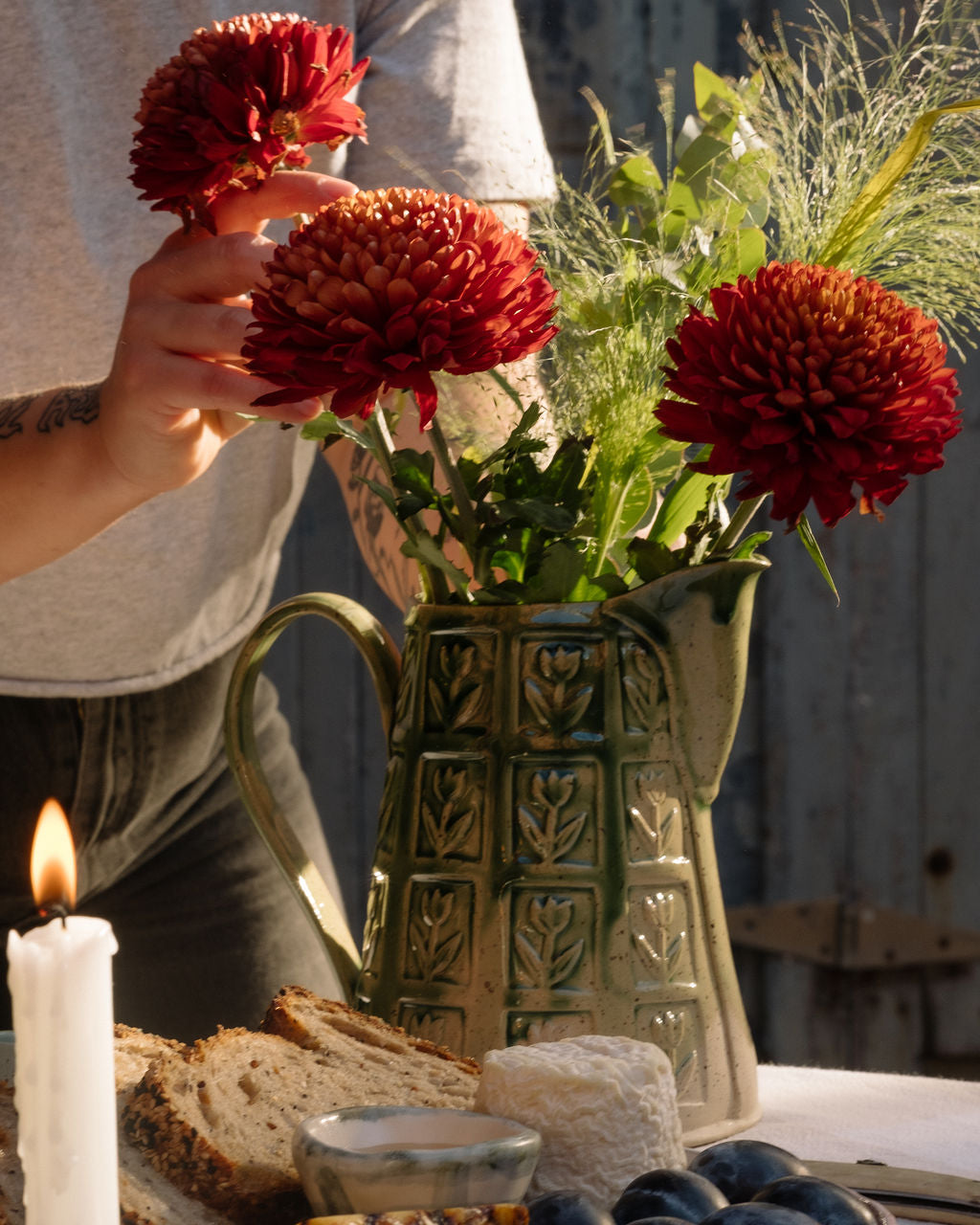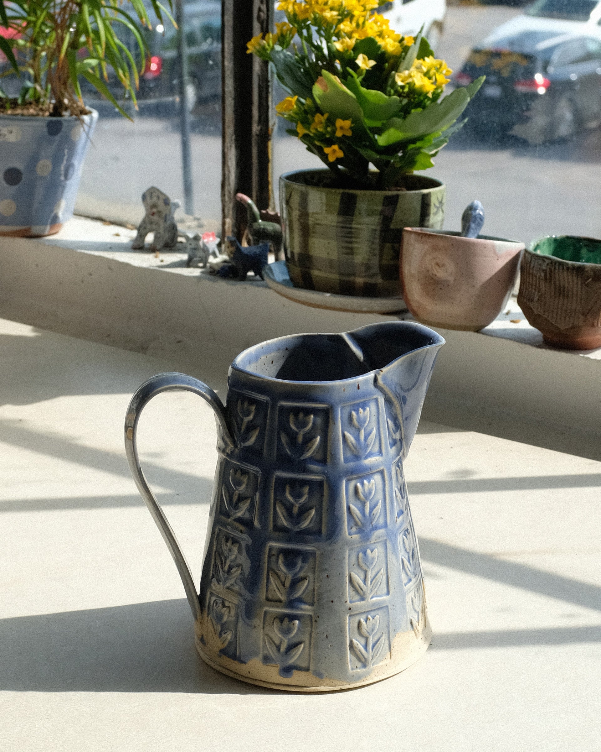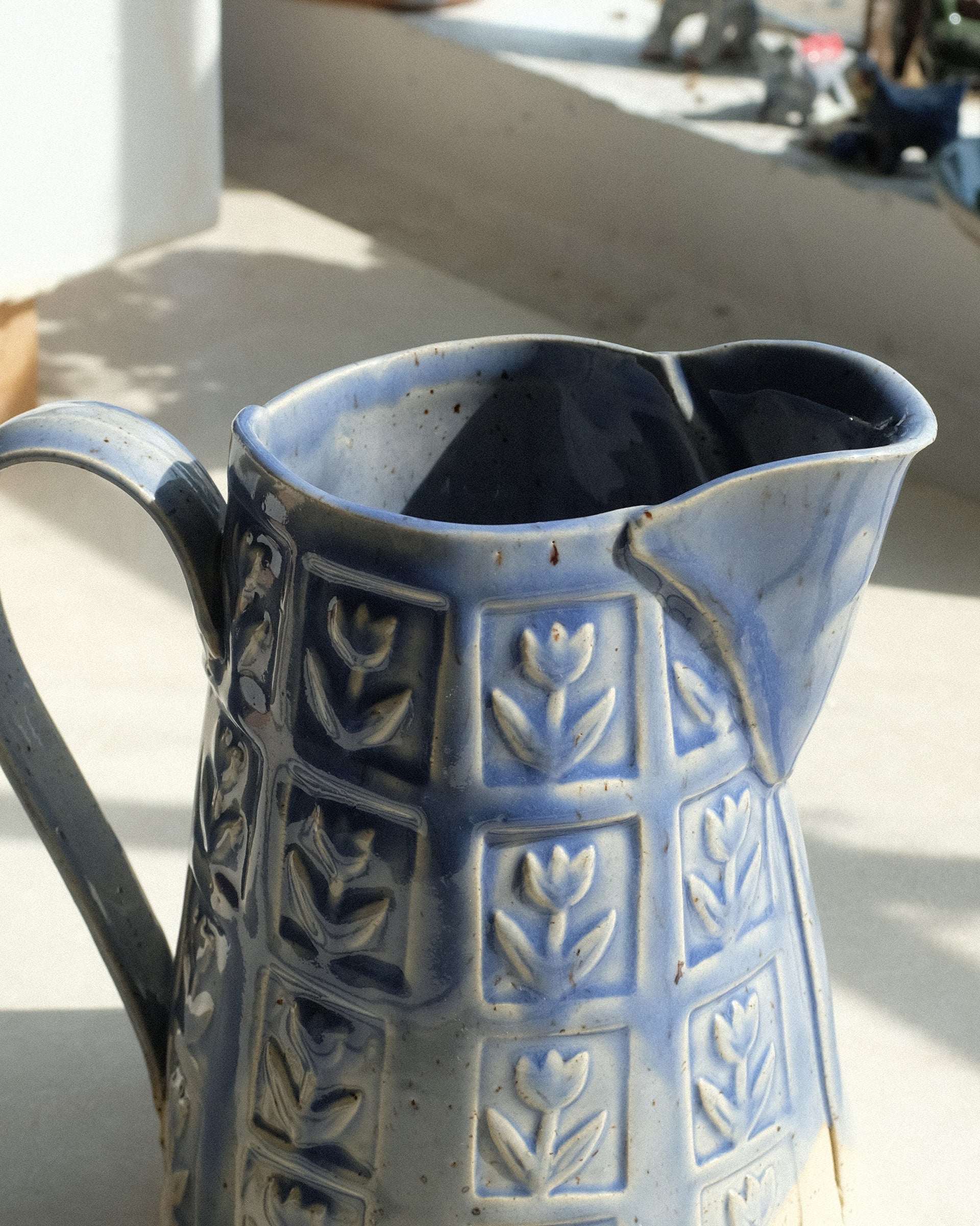 Pichet fabriqué à partir d'une plaque d'argile déroulée, découpée et estampée à l'aide de tampons en argile sculptés à la main. Émaillé avec un vernis translucide brillant qui se dépose dans les rainures des zones estampées pour accentuer les détails.