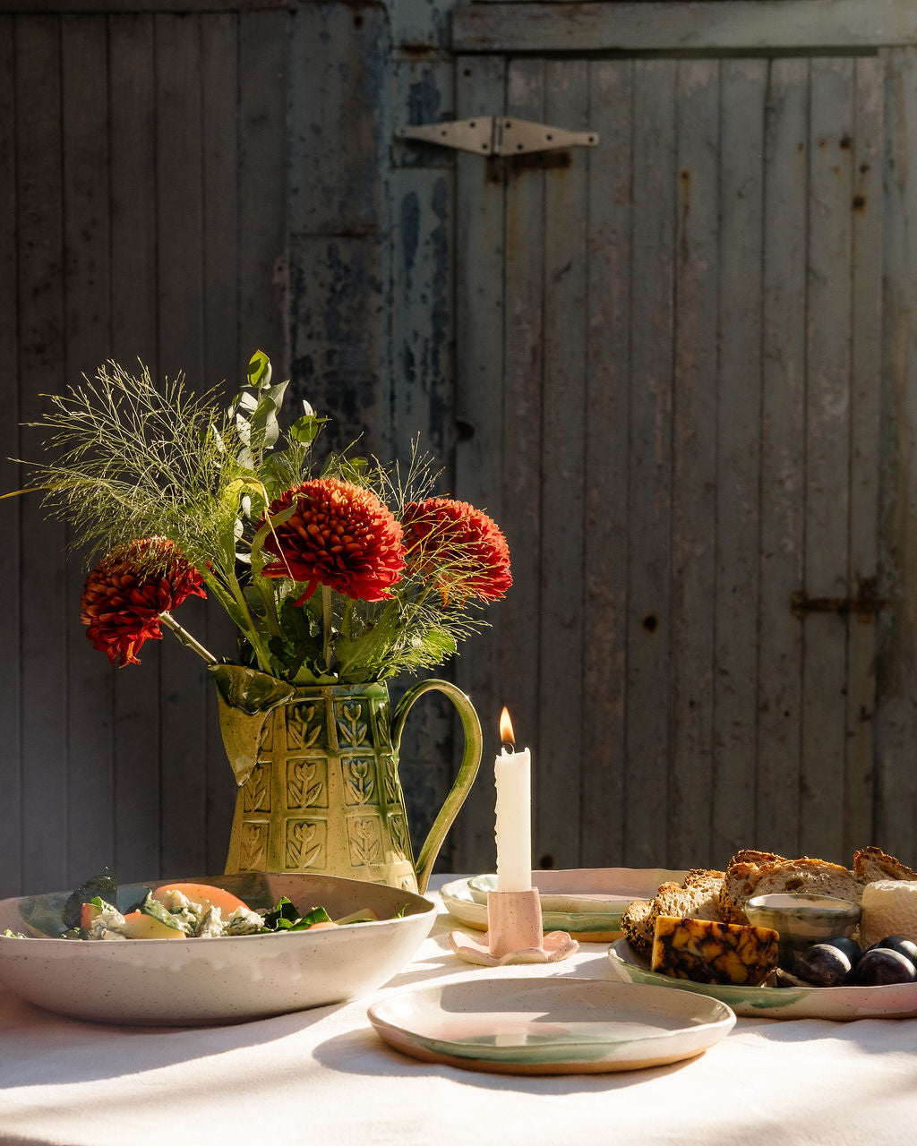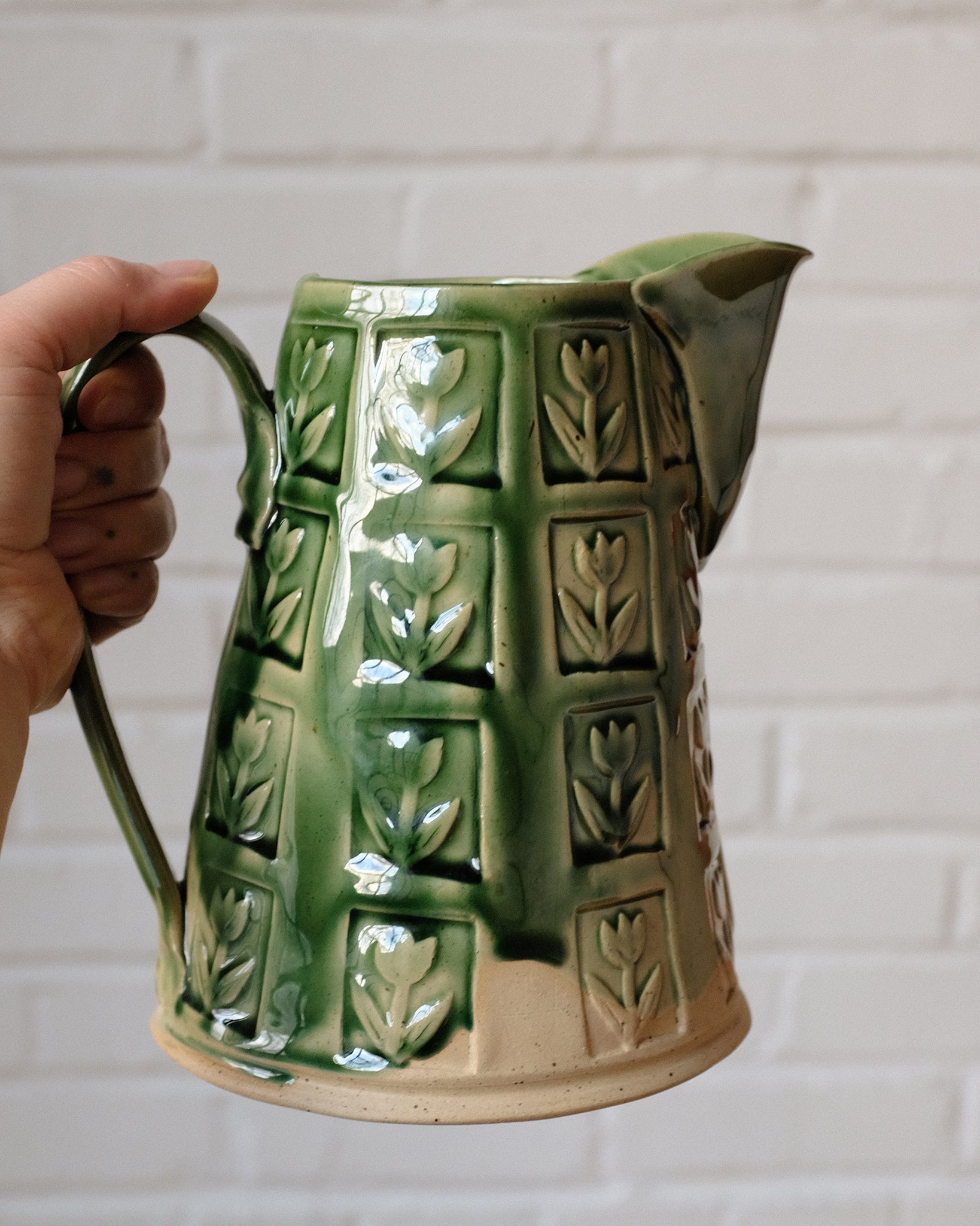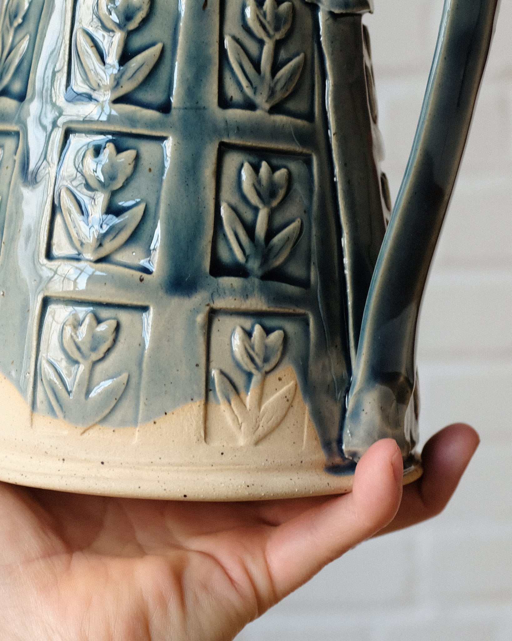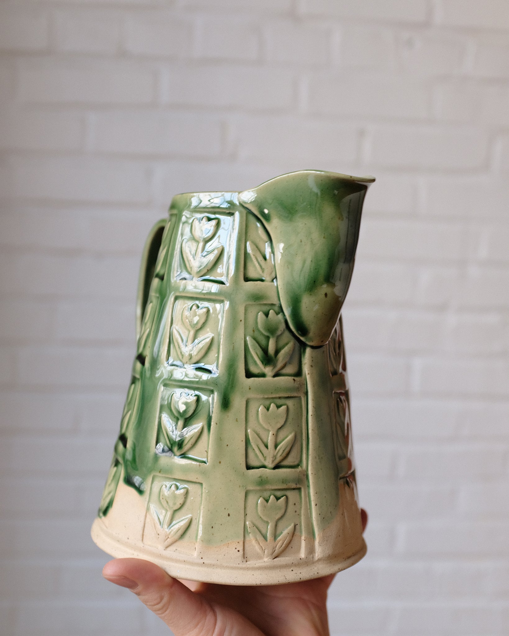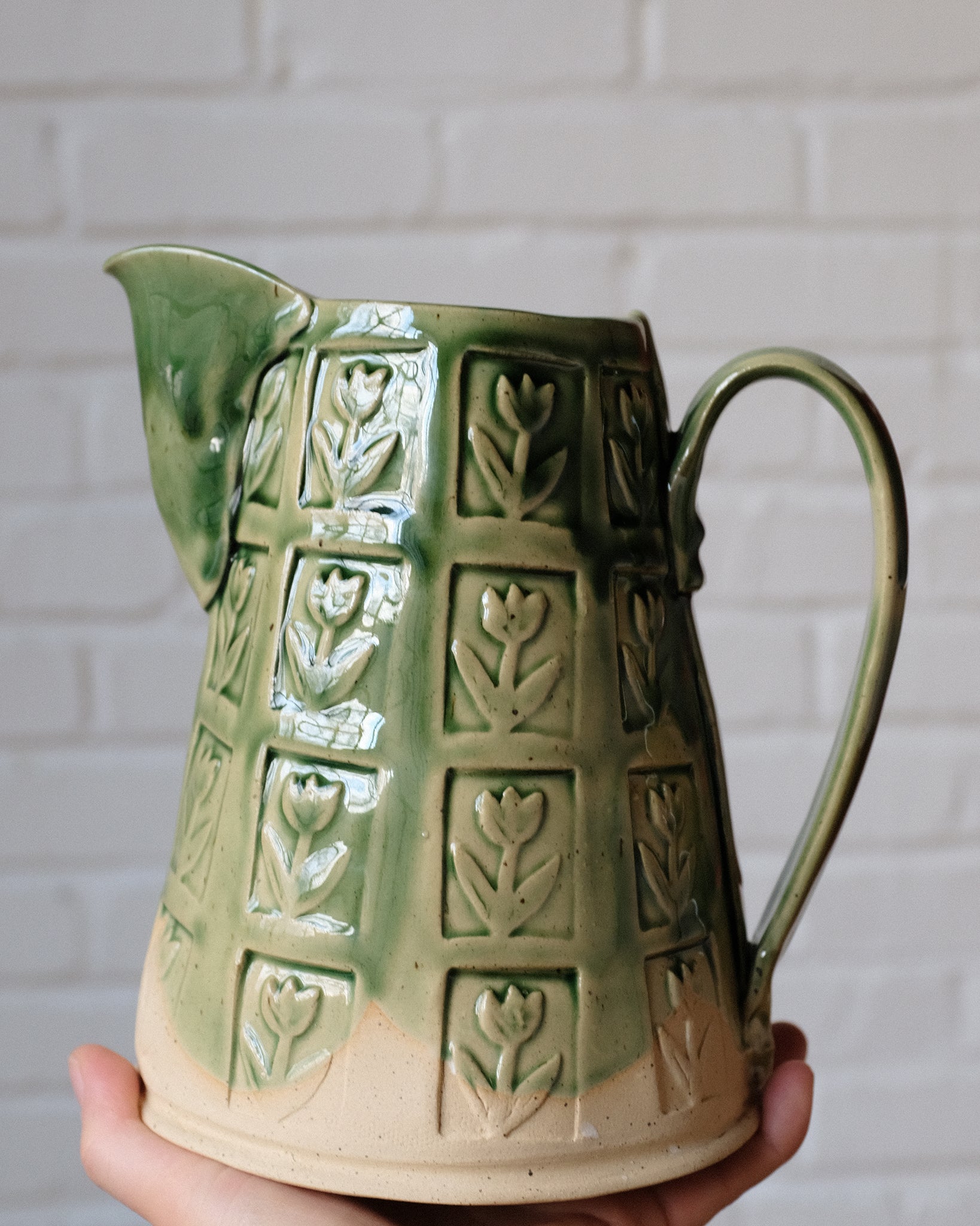 Pitcher made from a rolled out slab of clay, cut and stamped with hand-carved clay stamps. Glazed with a glossy translucent glaze that pools in the grooves of the stamped areas to accentuate the details.