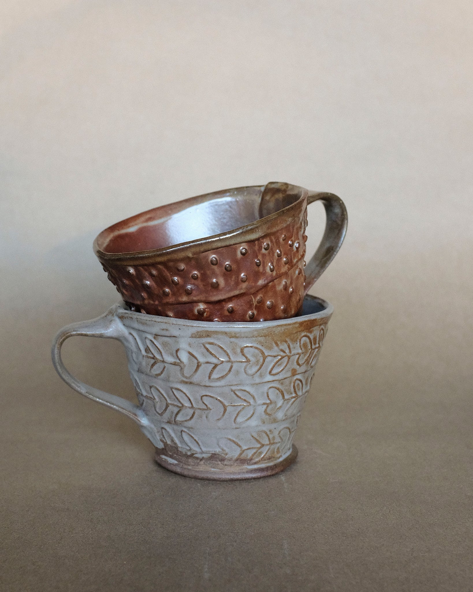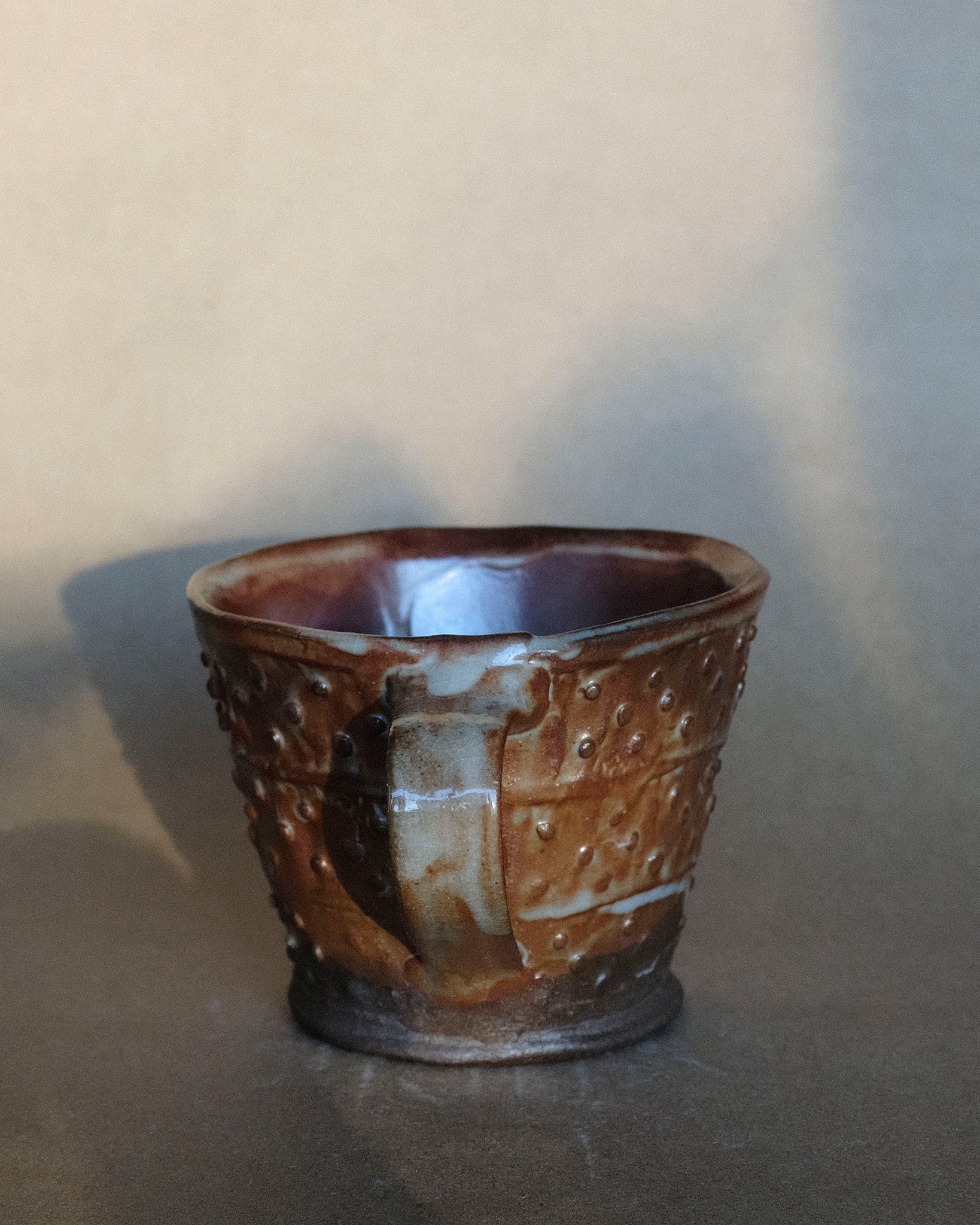 Red mid-fire stoneware. Raised dot stamp. Cherry blossom glaze with delicate crackle over entire surface. Fired in the back of the kiln to cone 7~