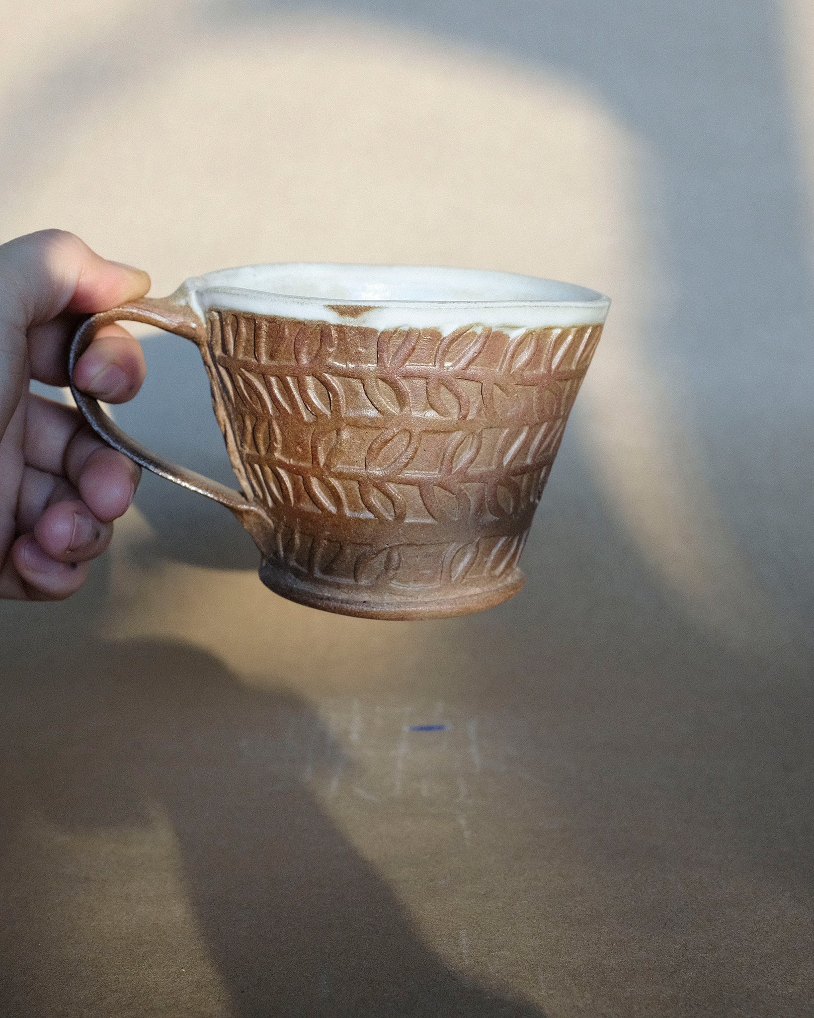 Red mid-fire stoneware, repeating leaf stamp. Glazed interior with a zinc white glaze, exterior unglazed clay. Fired in the back of the kiln to cone 7~