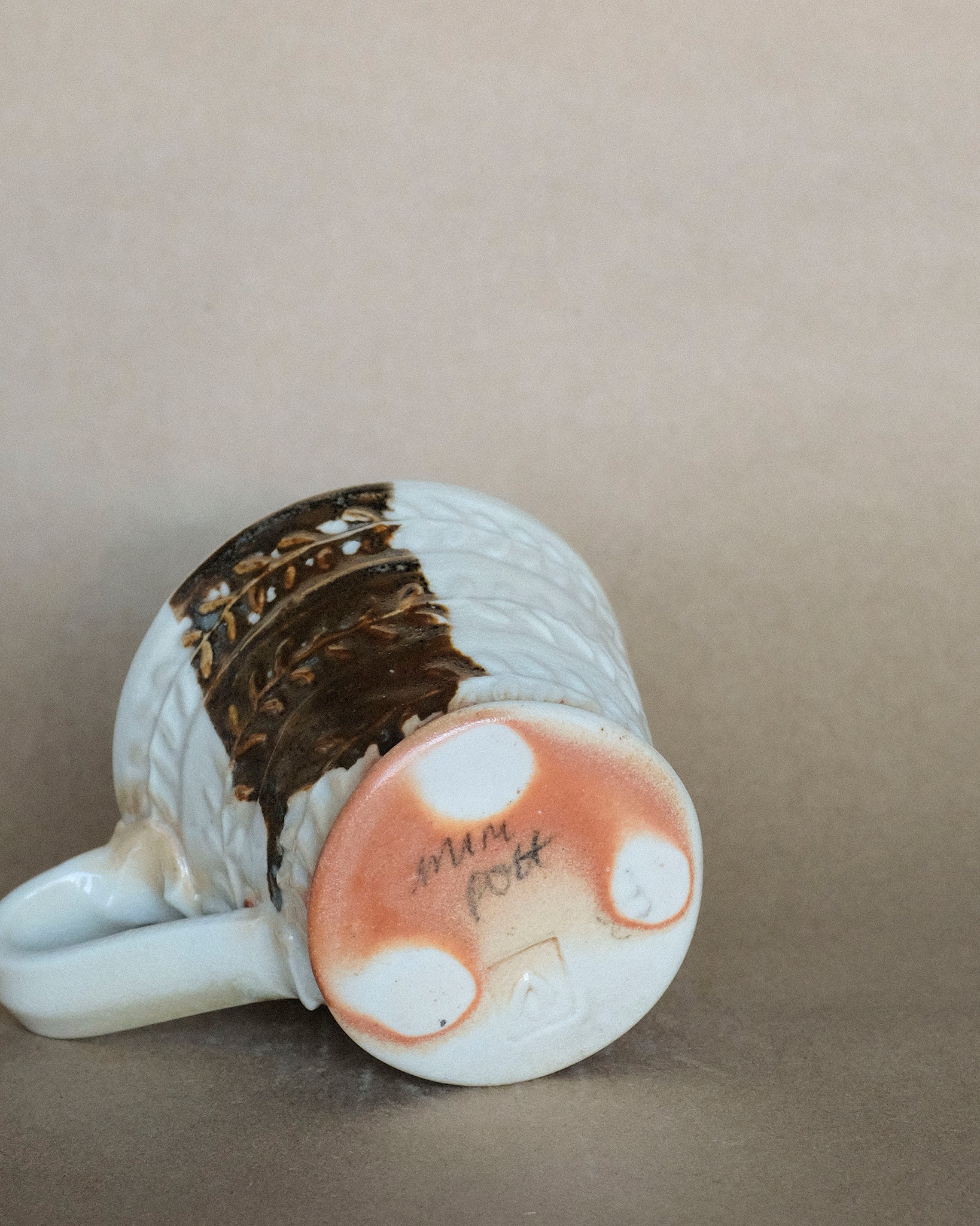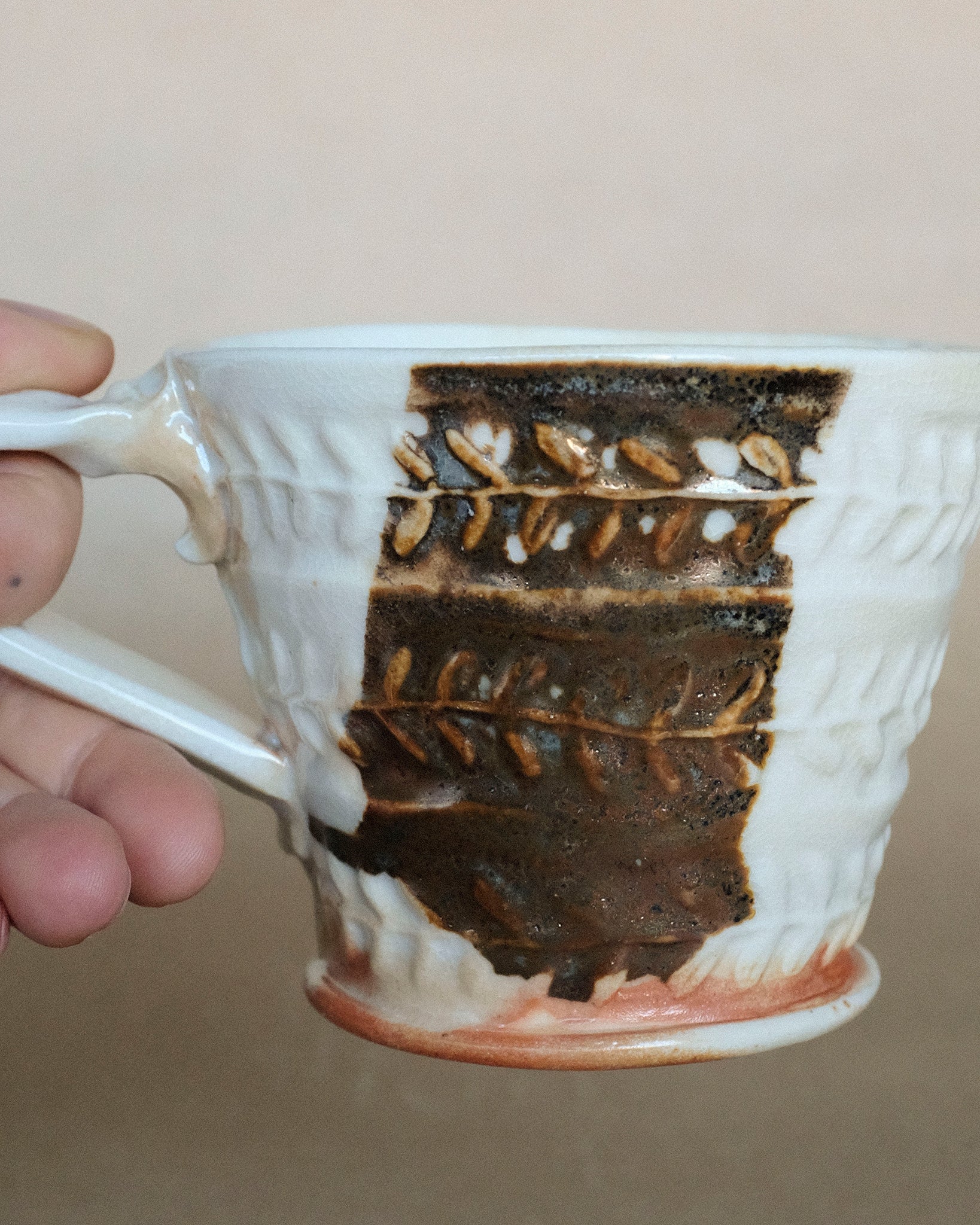 Tasse fabriquer en porcelaine, façonnage à la plaque avec motifs. Décorer avec un émail à base de cendre de bois.