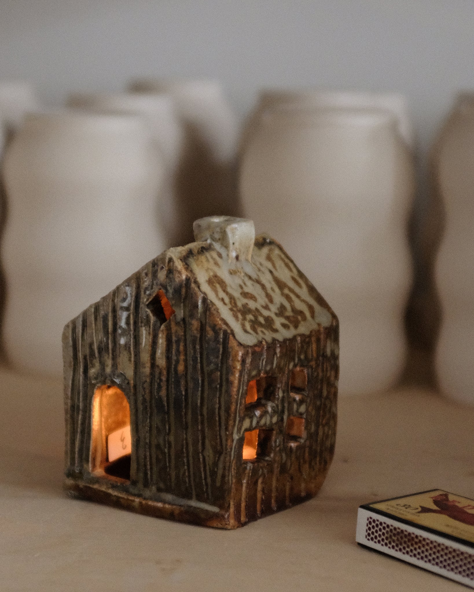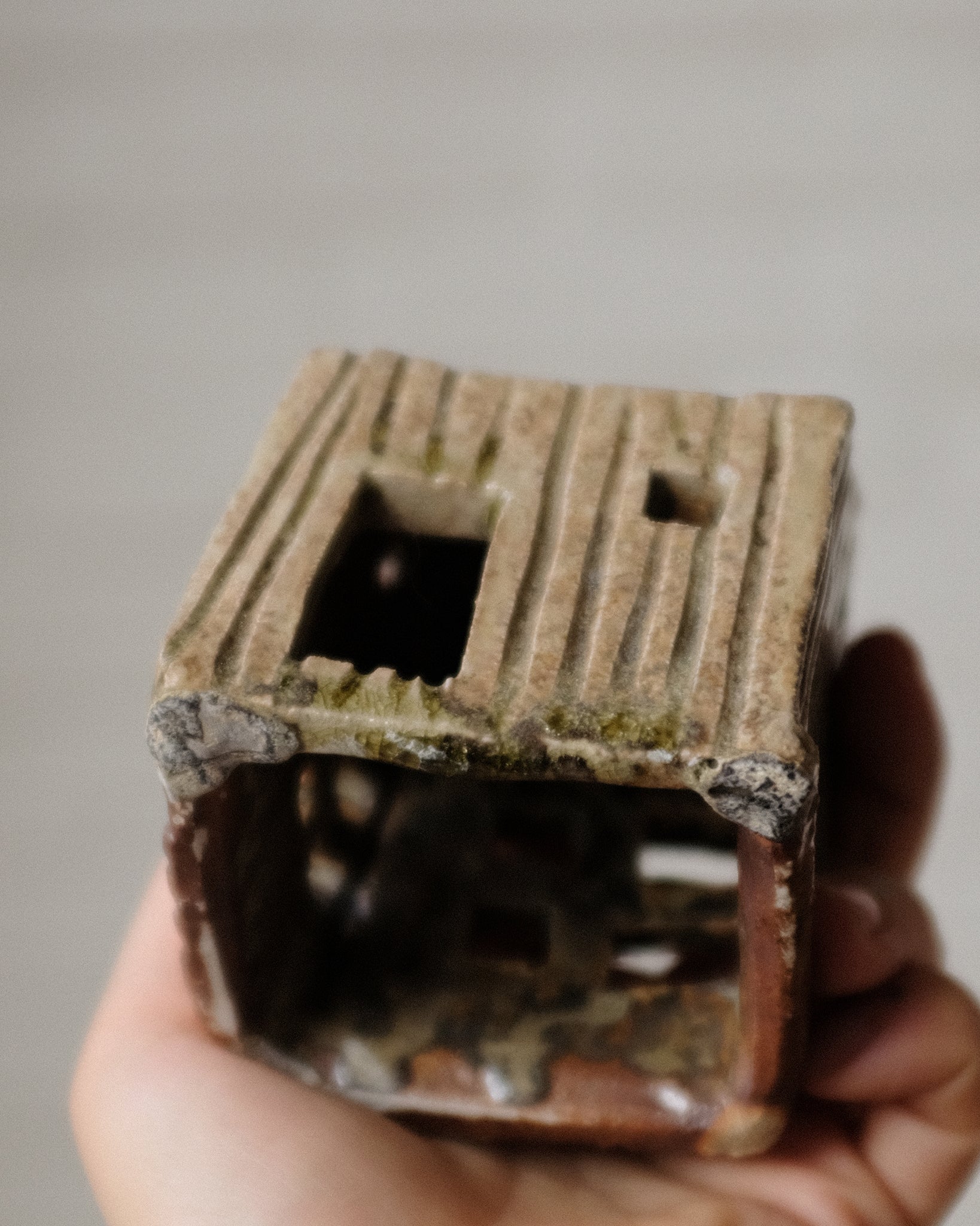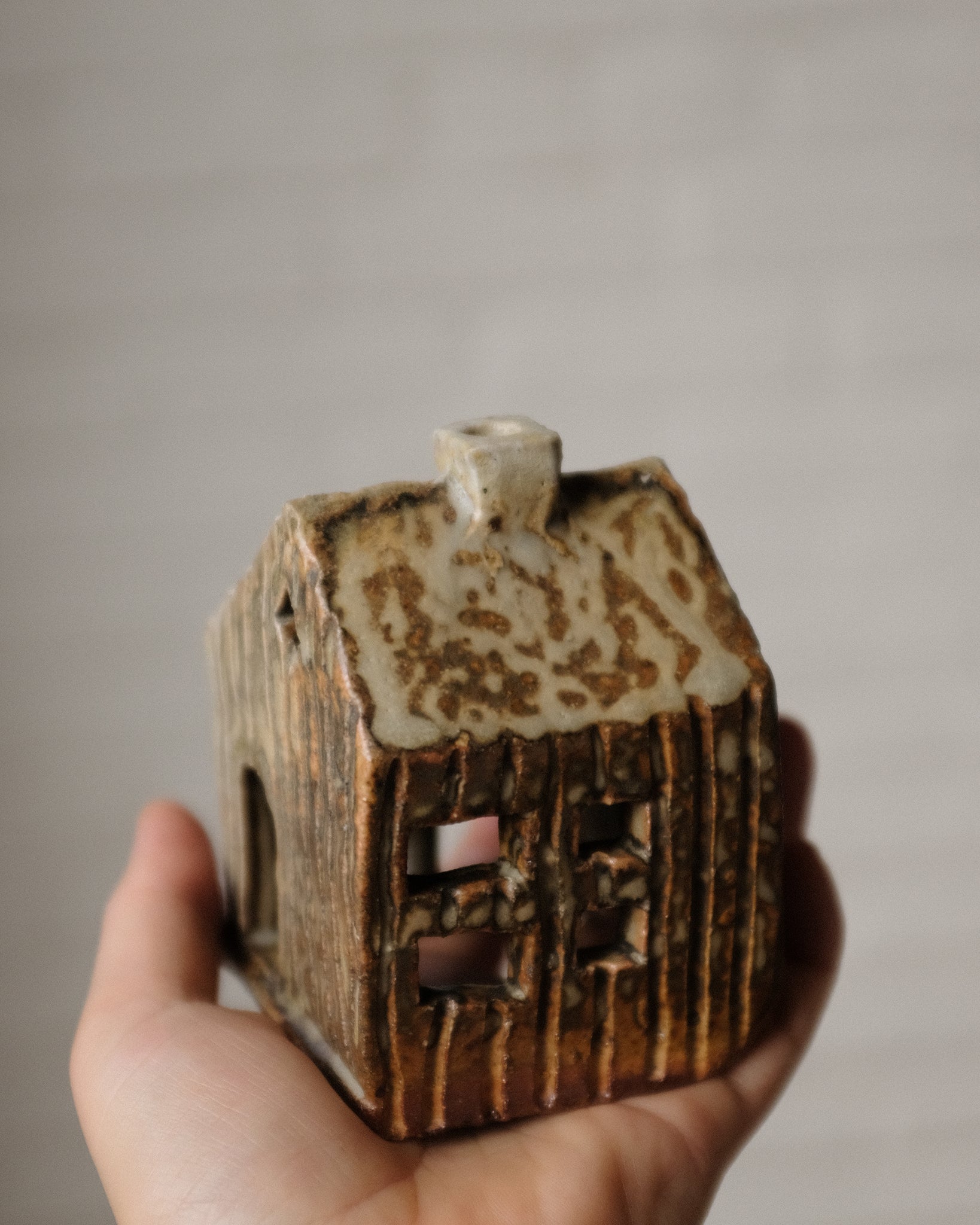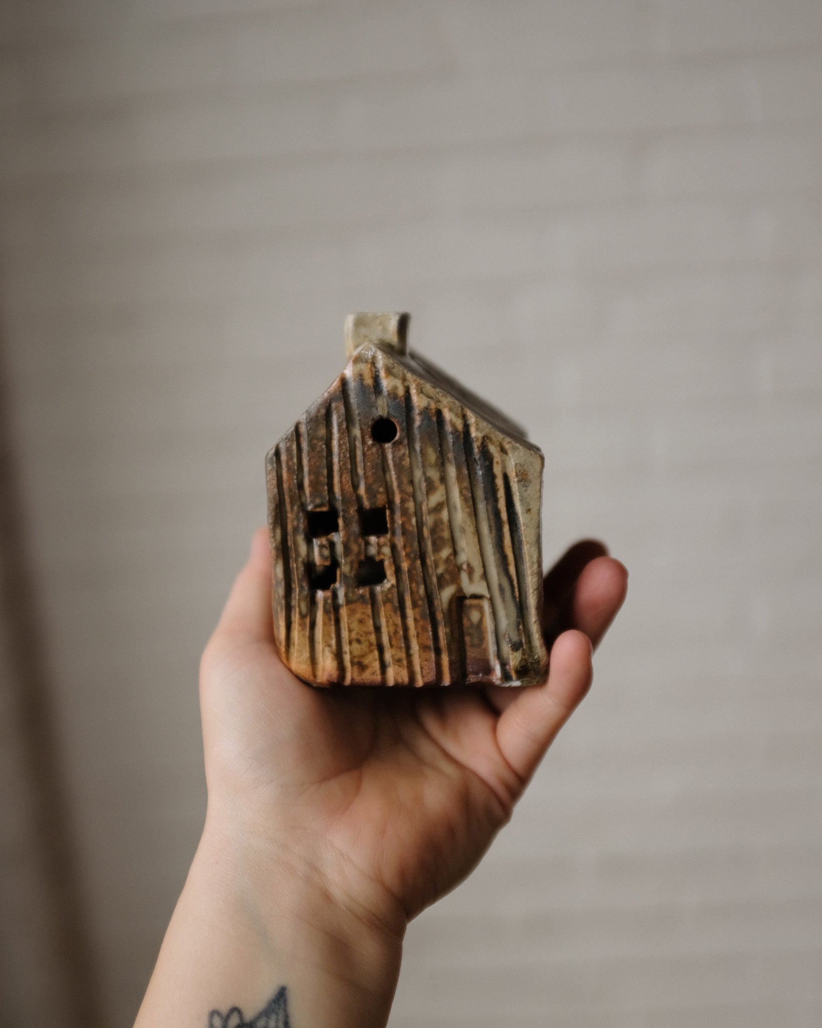 This sweet little house is for incense or a candle. Handmade from porcelain with no glaze. All the colour is from the fire and ash.