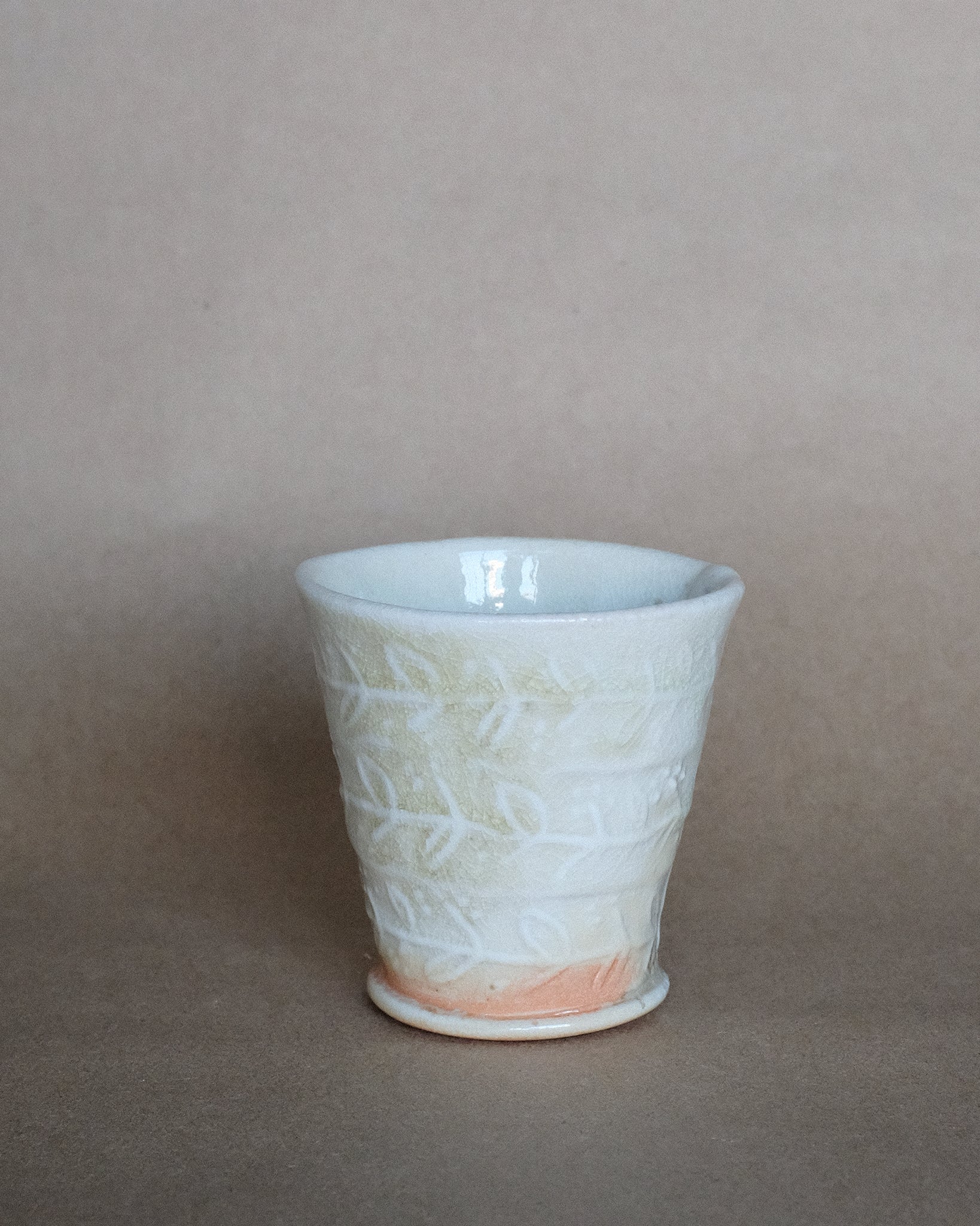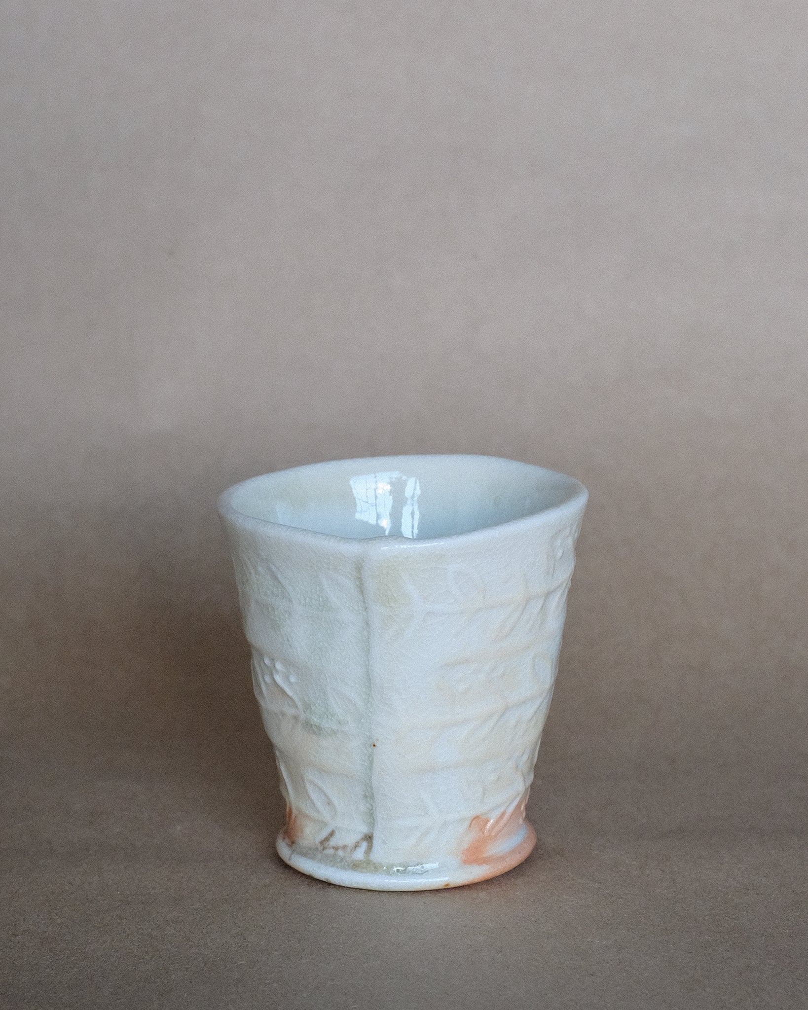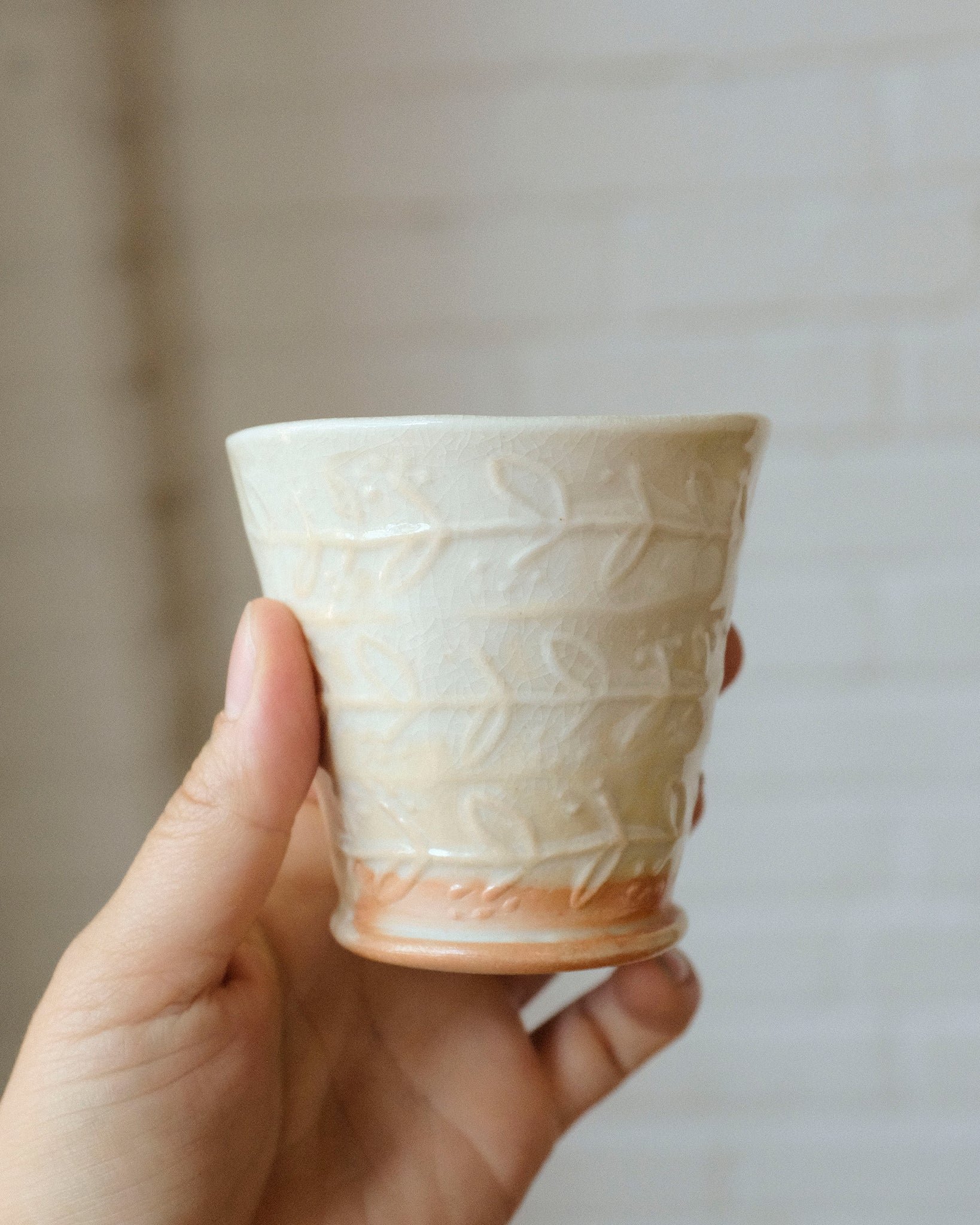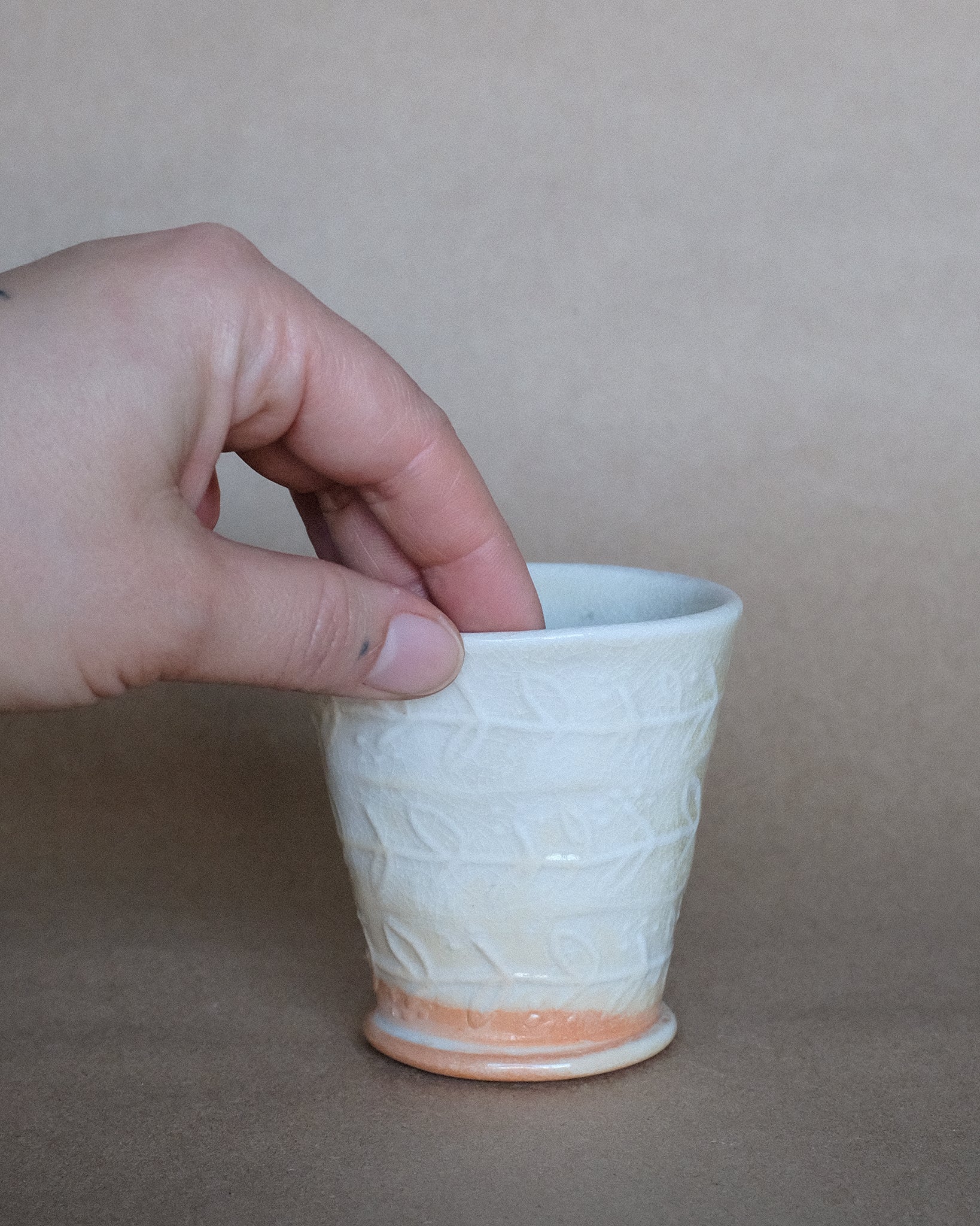 Petite tasse fabriquer en porcelaine, façonnage à la plaque avec motifs. Décorer avec un émail à base de cendre de bois.