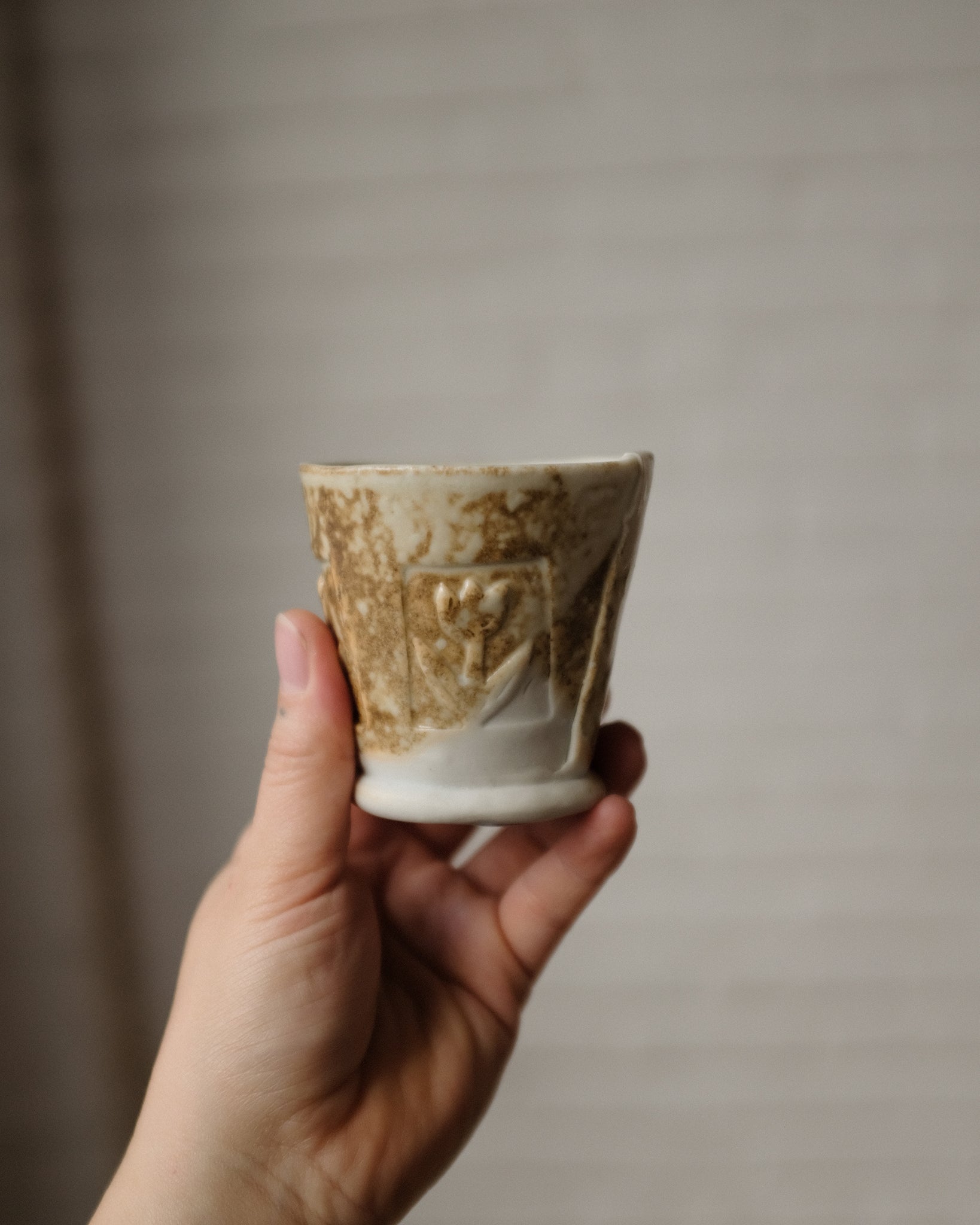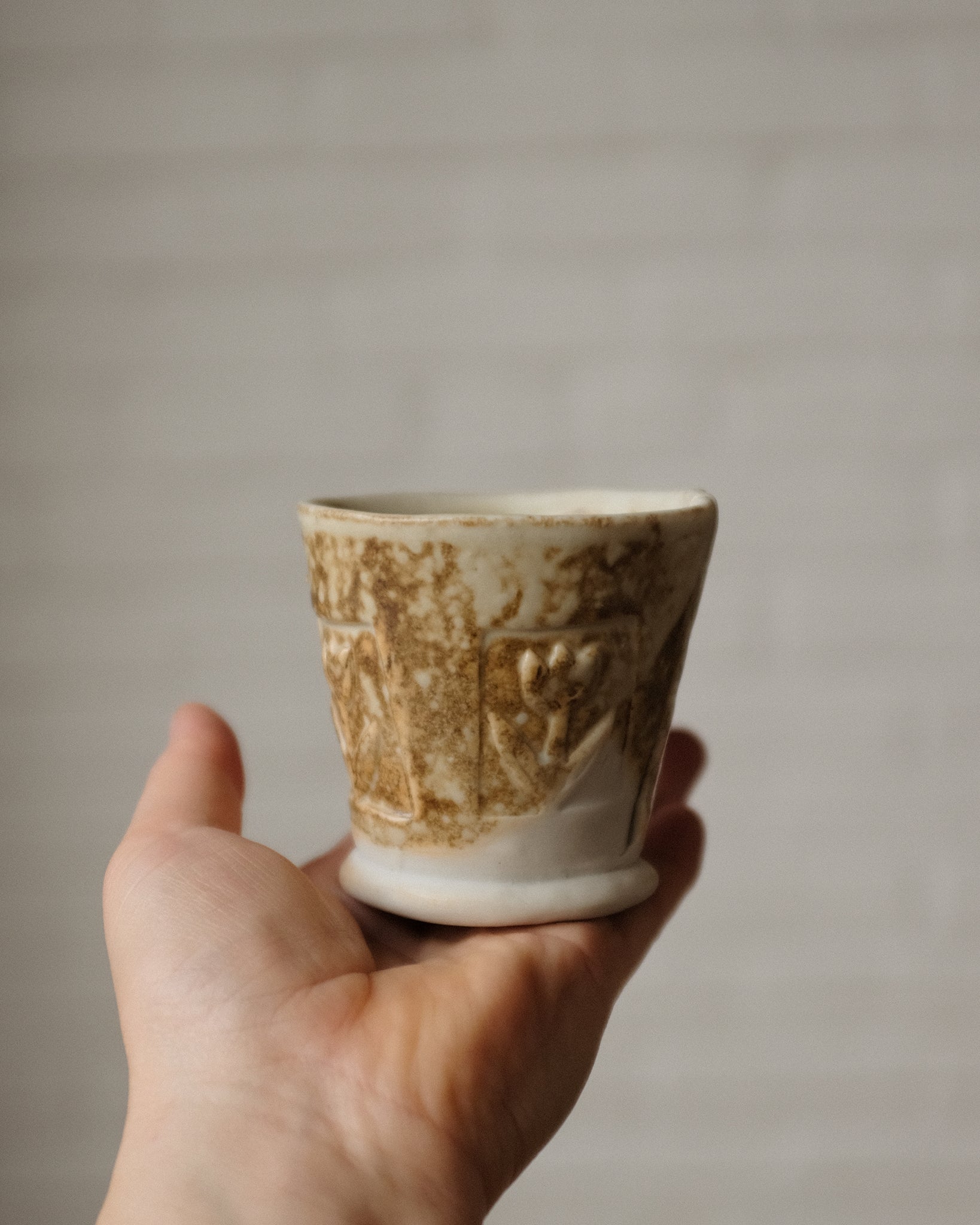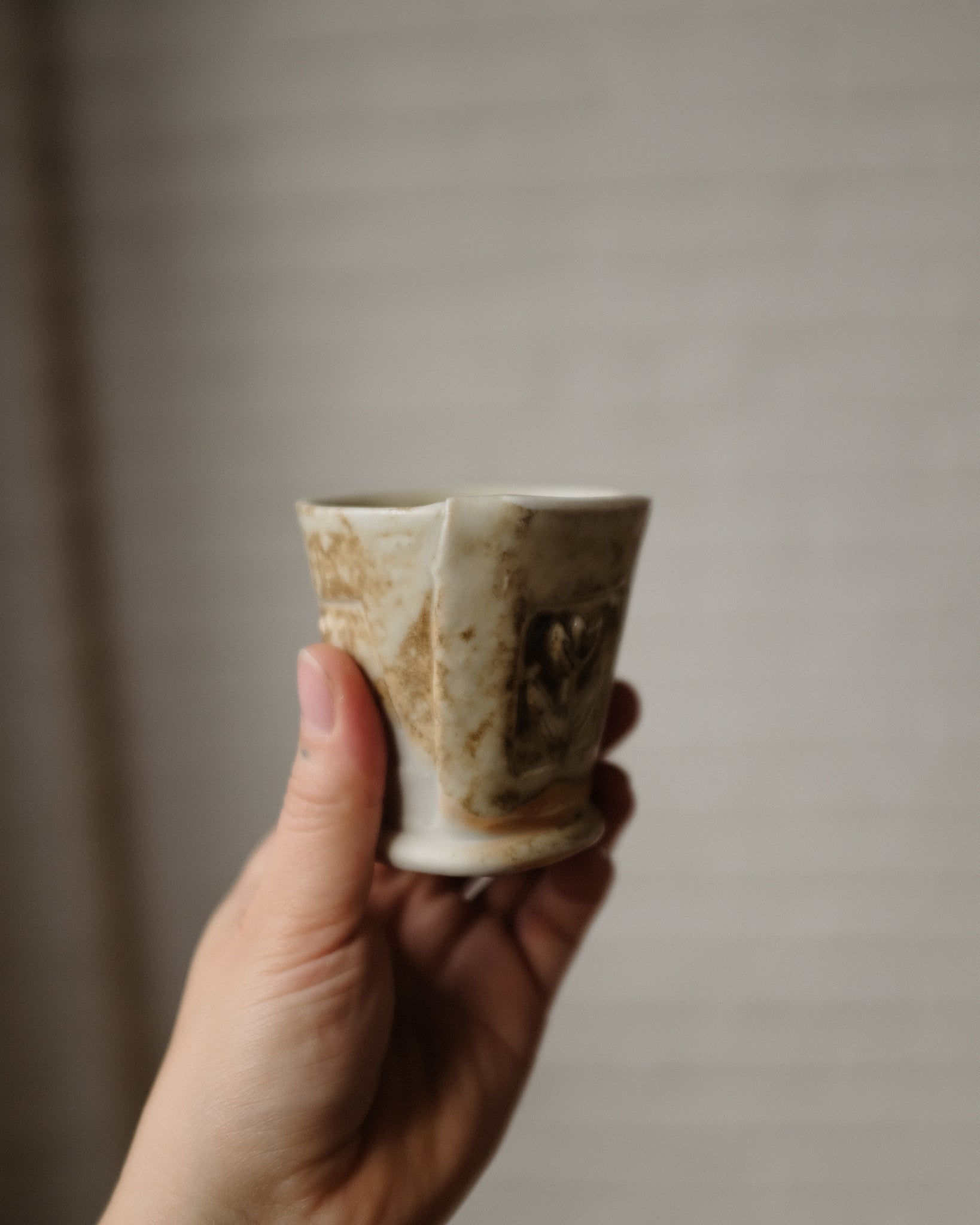 Petite tasse fabriquer en porcelaine, façonnage à la plaque avec motifs. Décorer avec un émail Shino. Cendre de bois et feux.