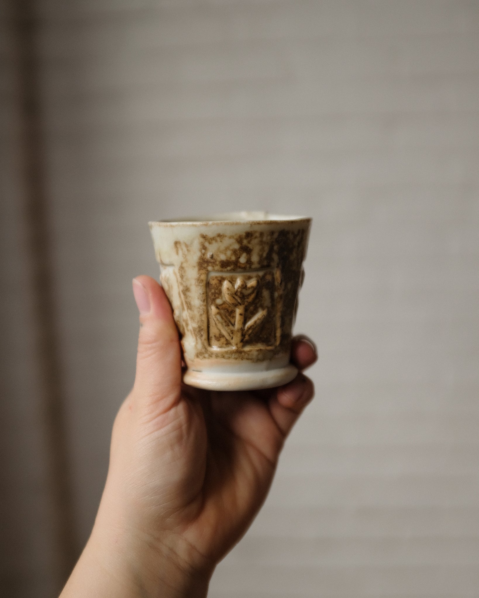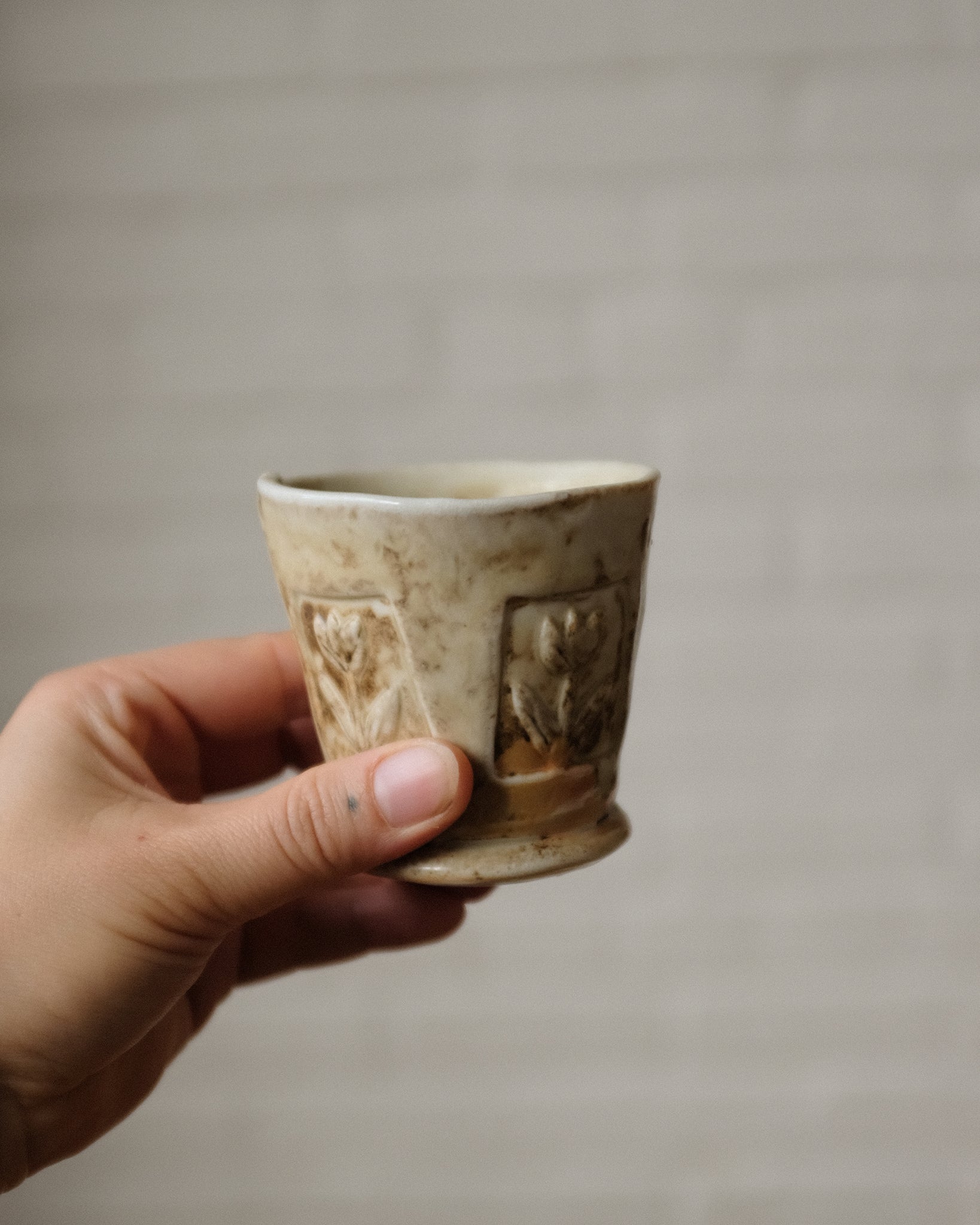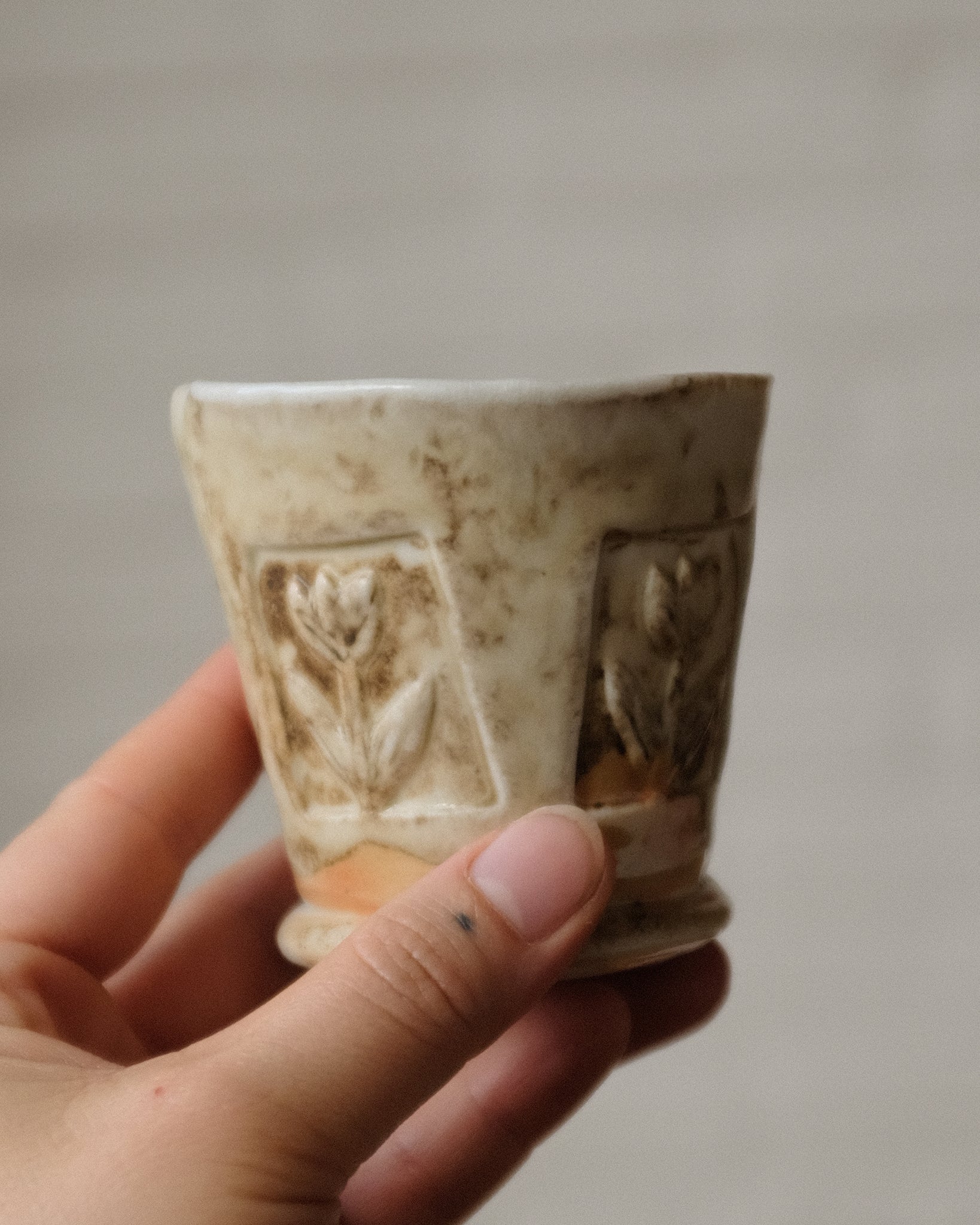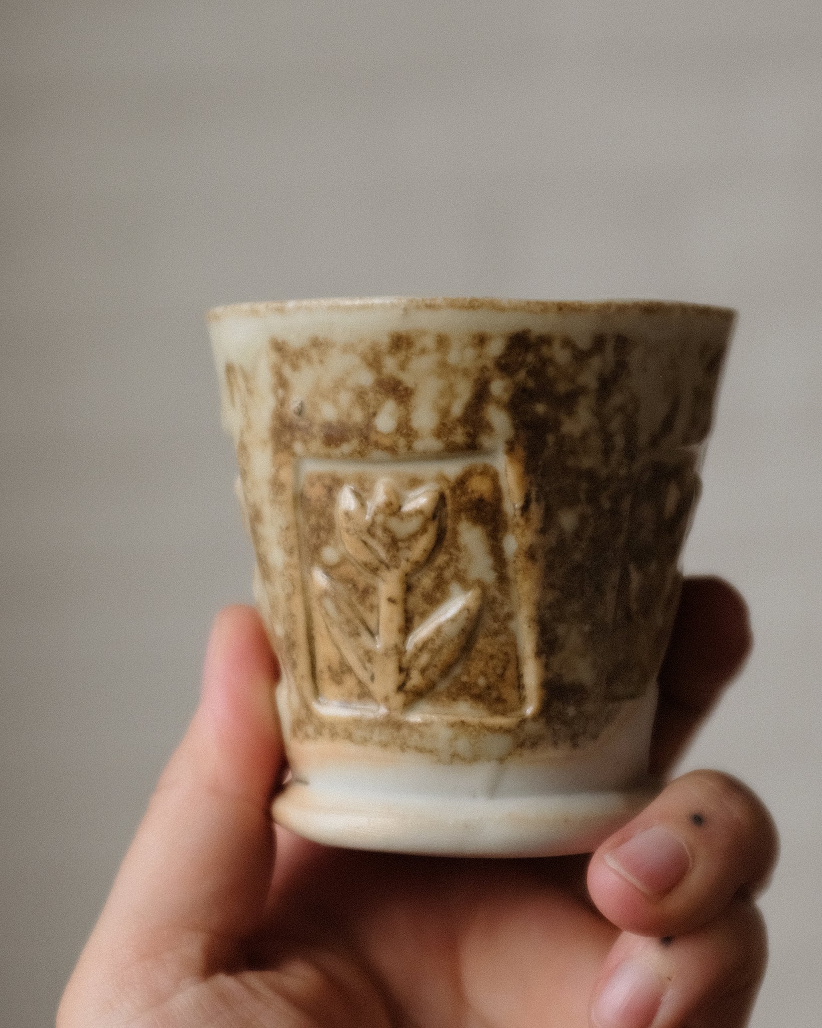 Petite tasse fabriquer en porcelaine, façonnage à la plaque avec motifs. Décorer avec un émail Shino. Cendre de bois et feux.