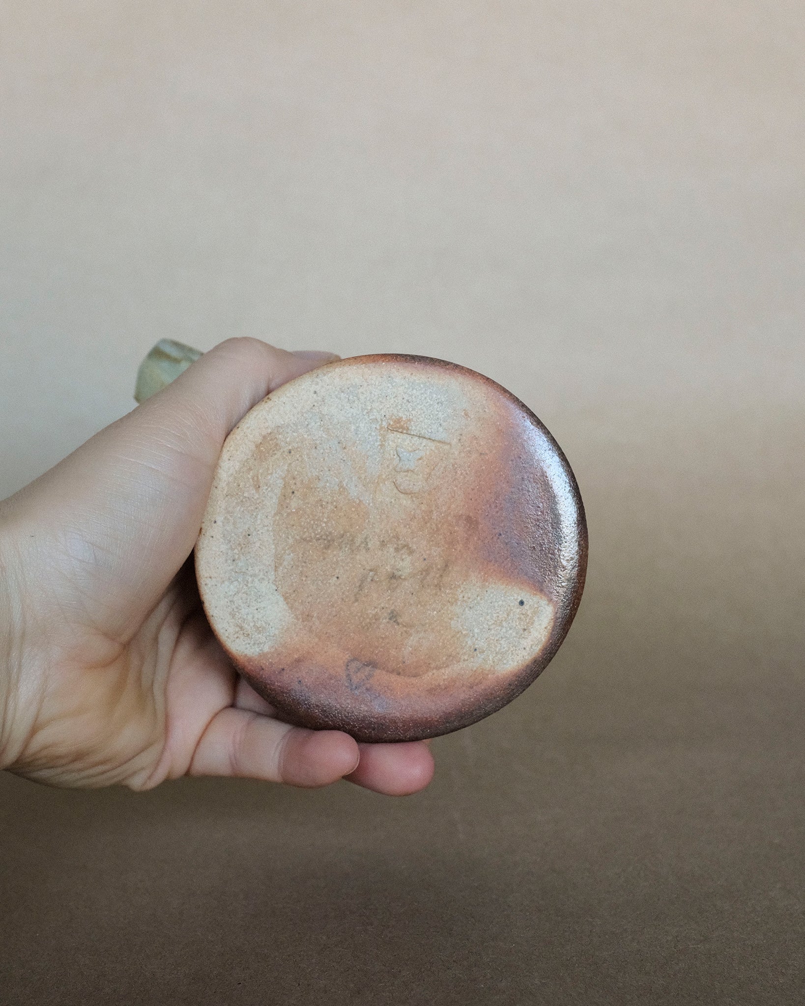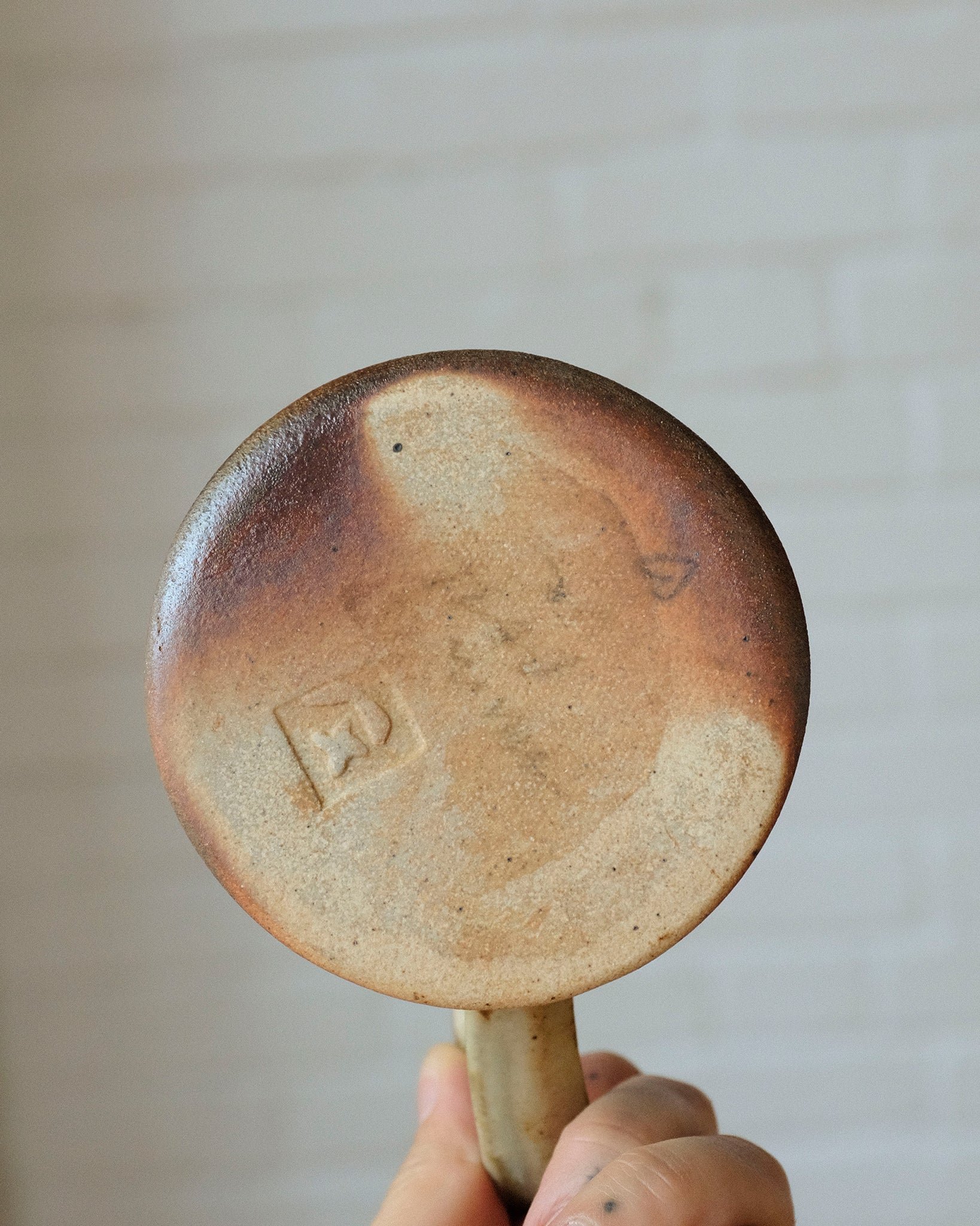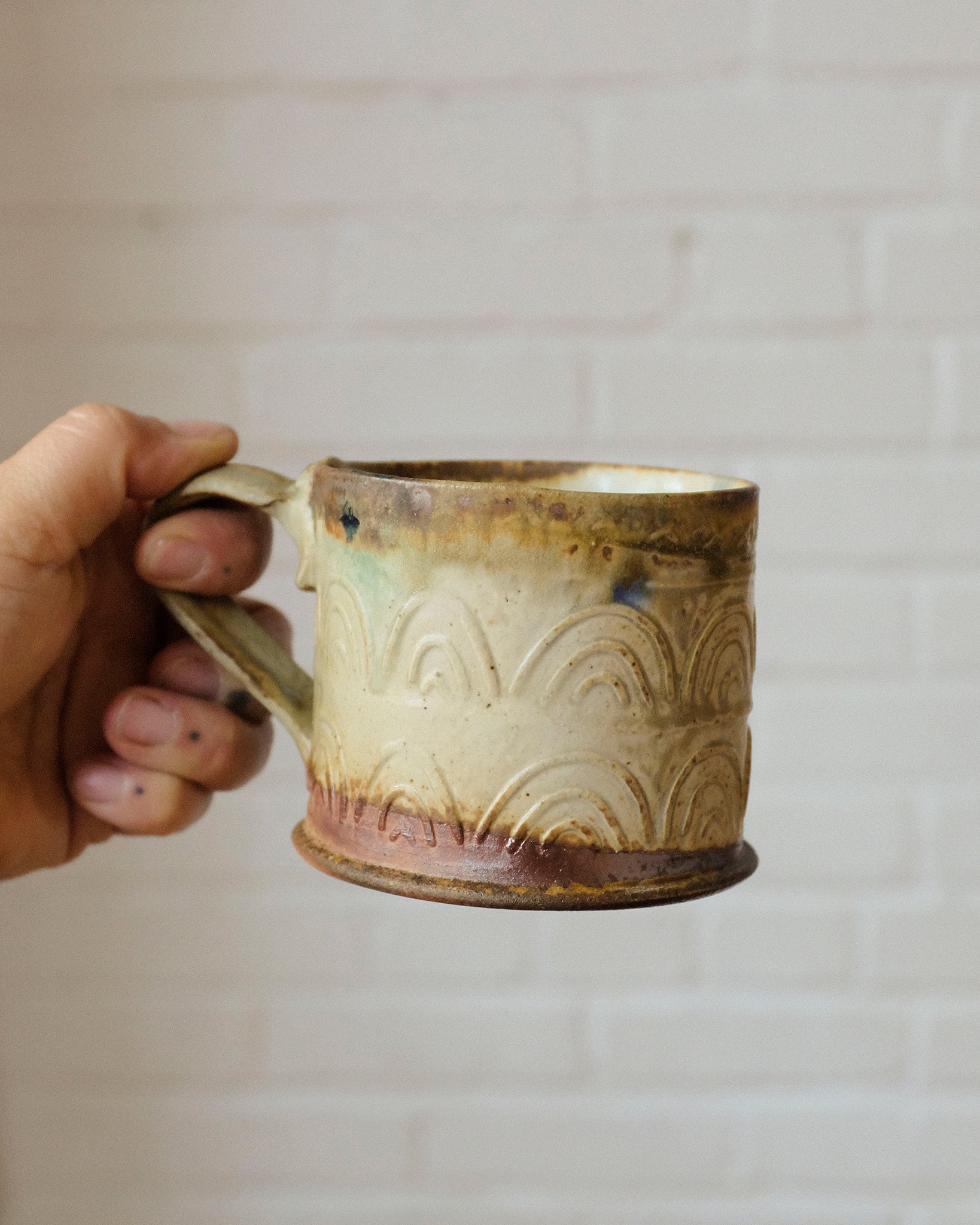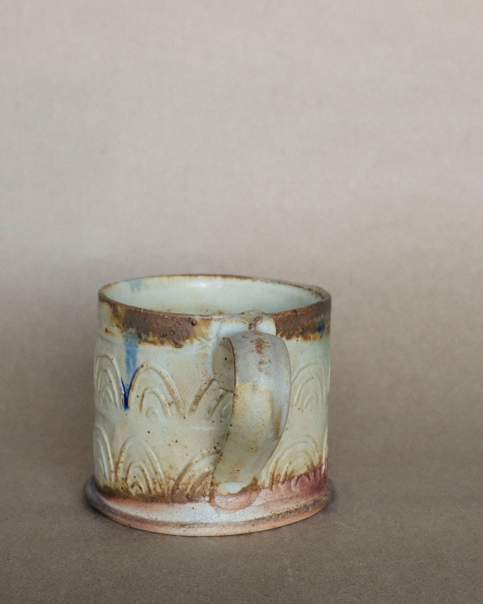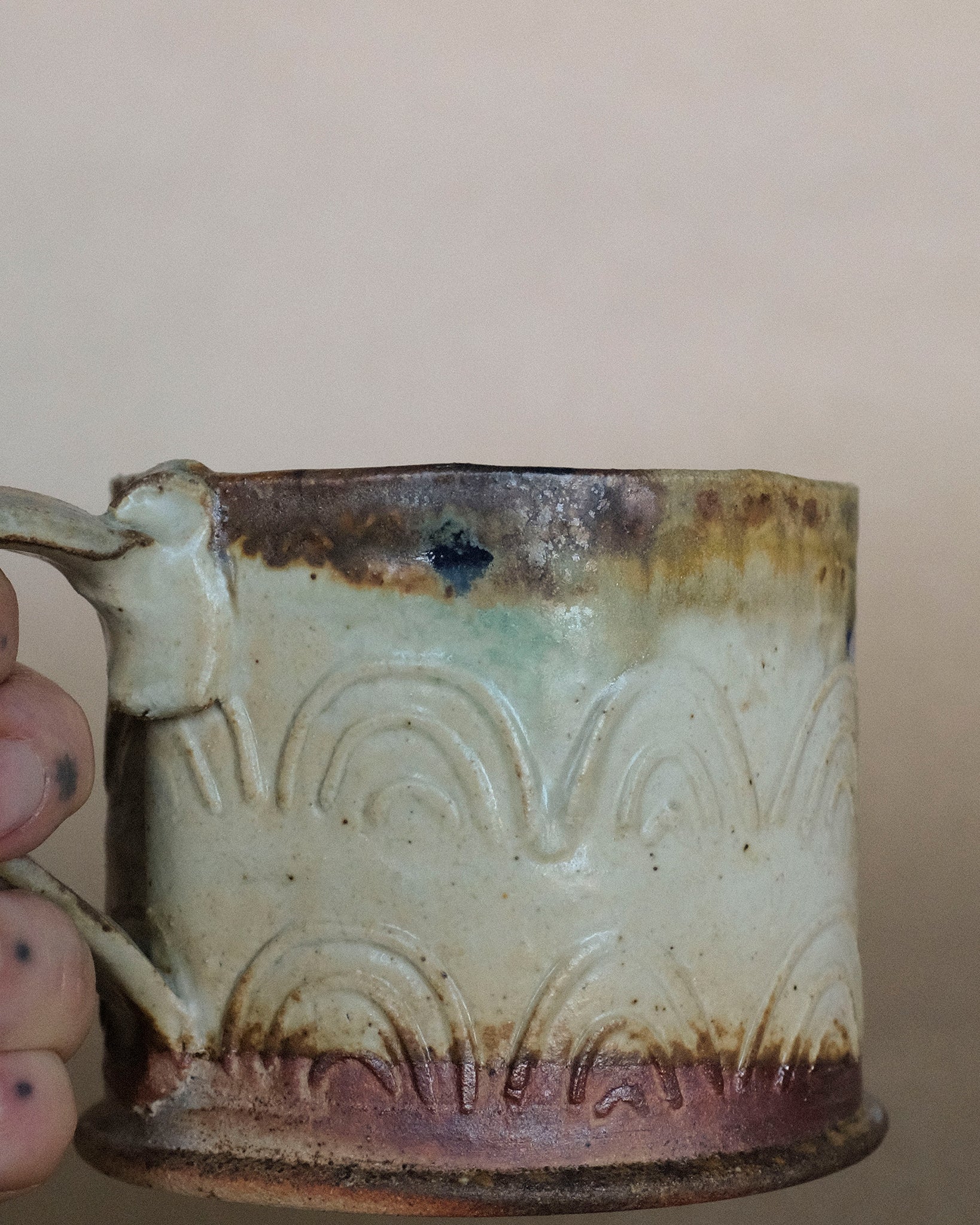stoneware. Repeating arch stamp, and repeating x motif stamp on rim. Matt ash glaze, with wild clay and cobalt glaze (blue) dotted on rim. Melted ash. Lots of toasty colour variations throughout.