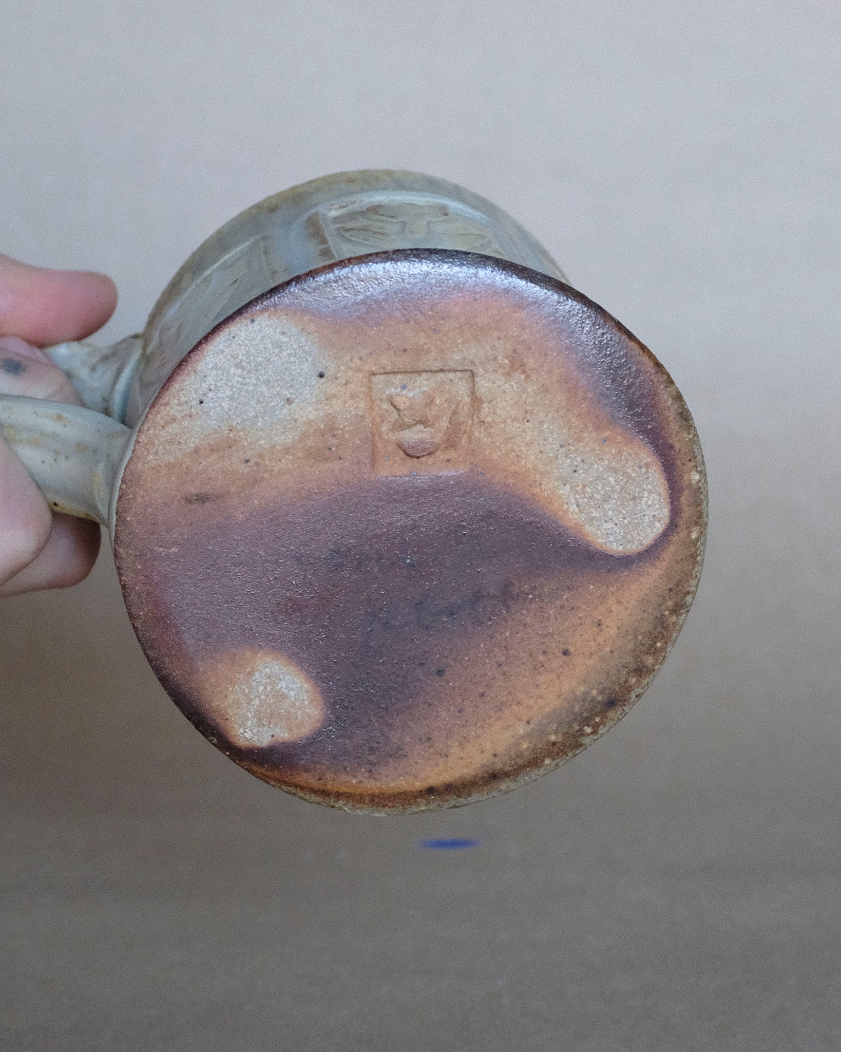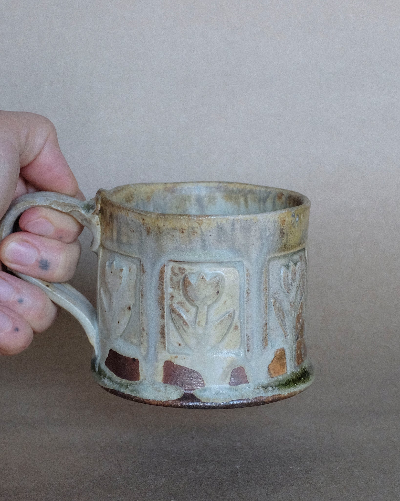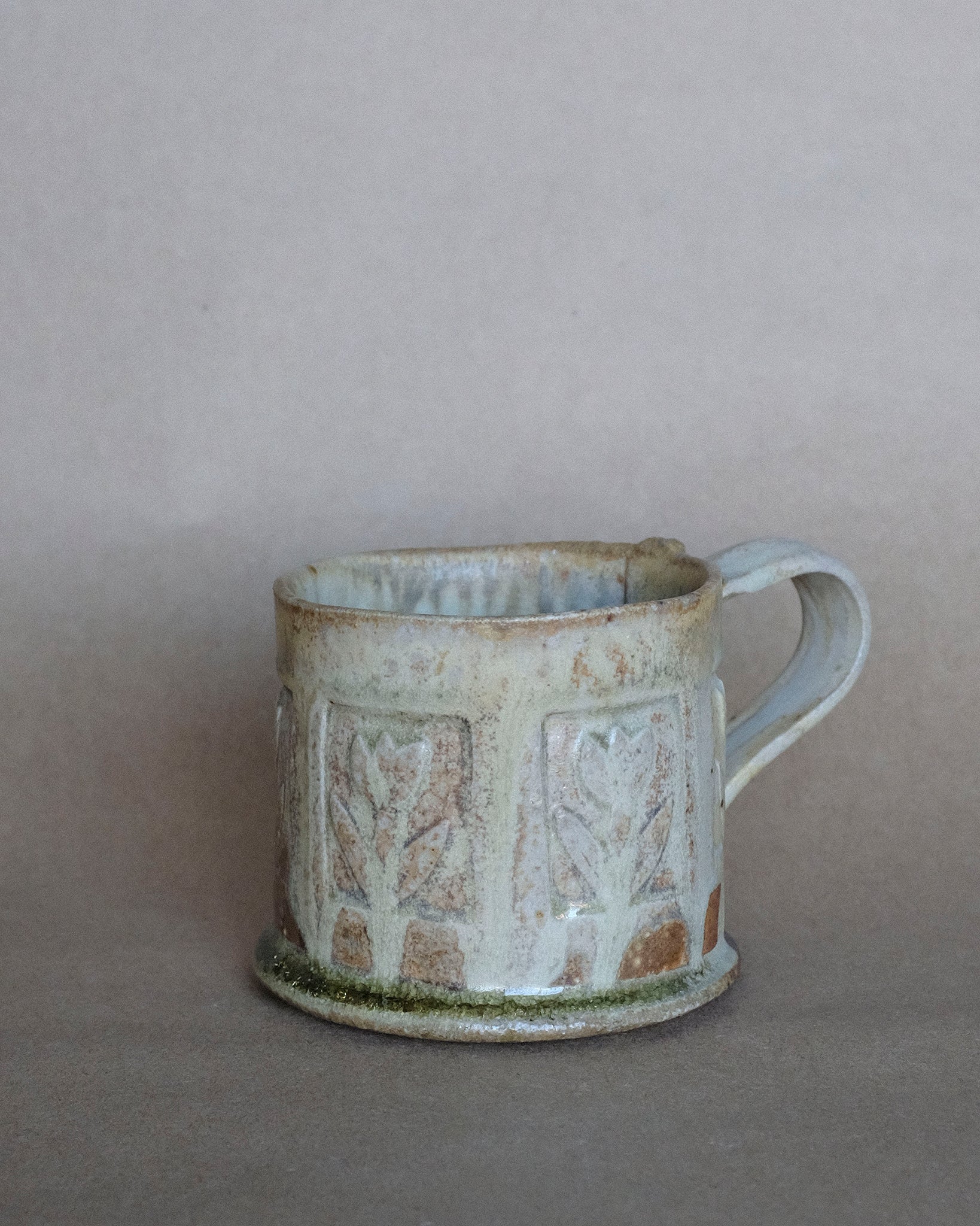 Stoneware. Tulip stamp motif. Ash glaze, with lots of heavy ash deposit melting into glossy green glaze.The surface has an incredible amount of action from the fire and the underside of the mug is equally stunning with the wadding marks.