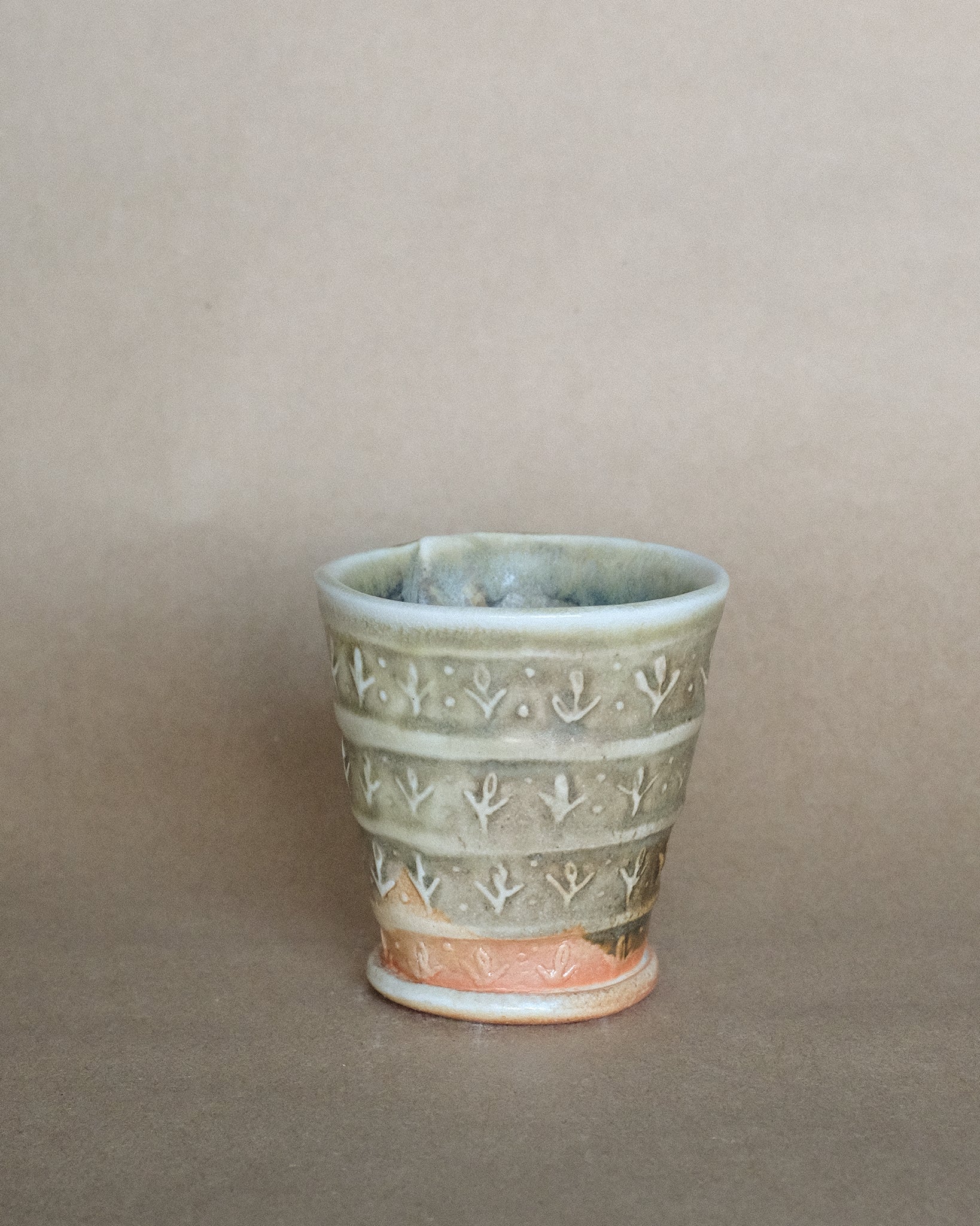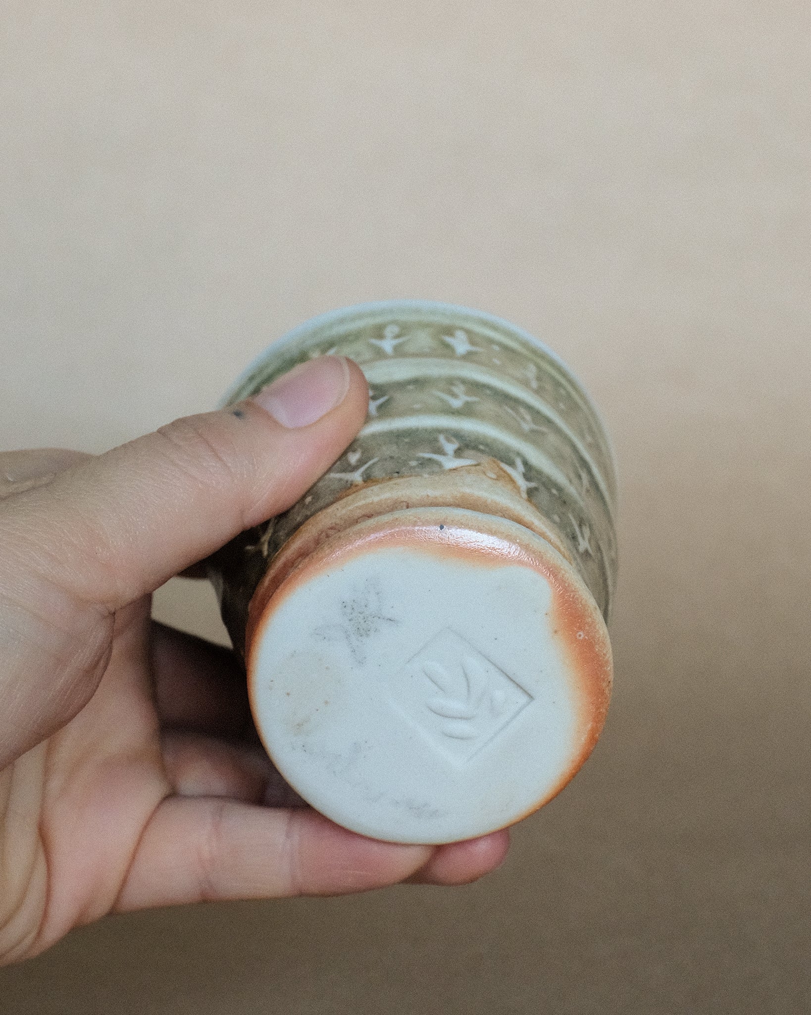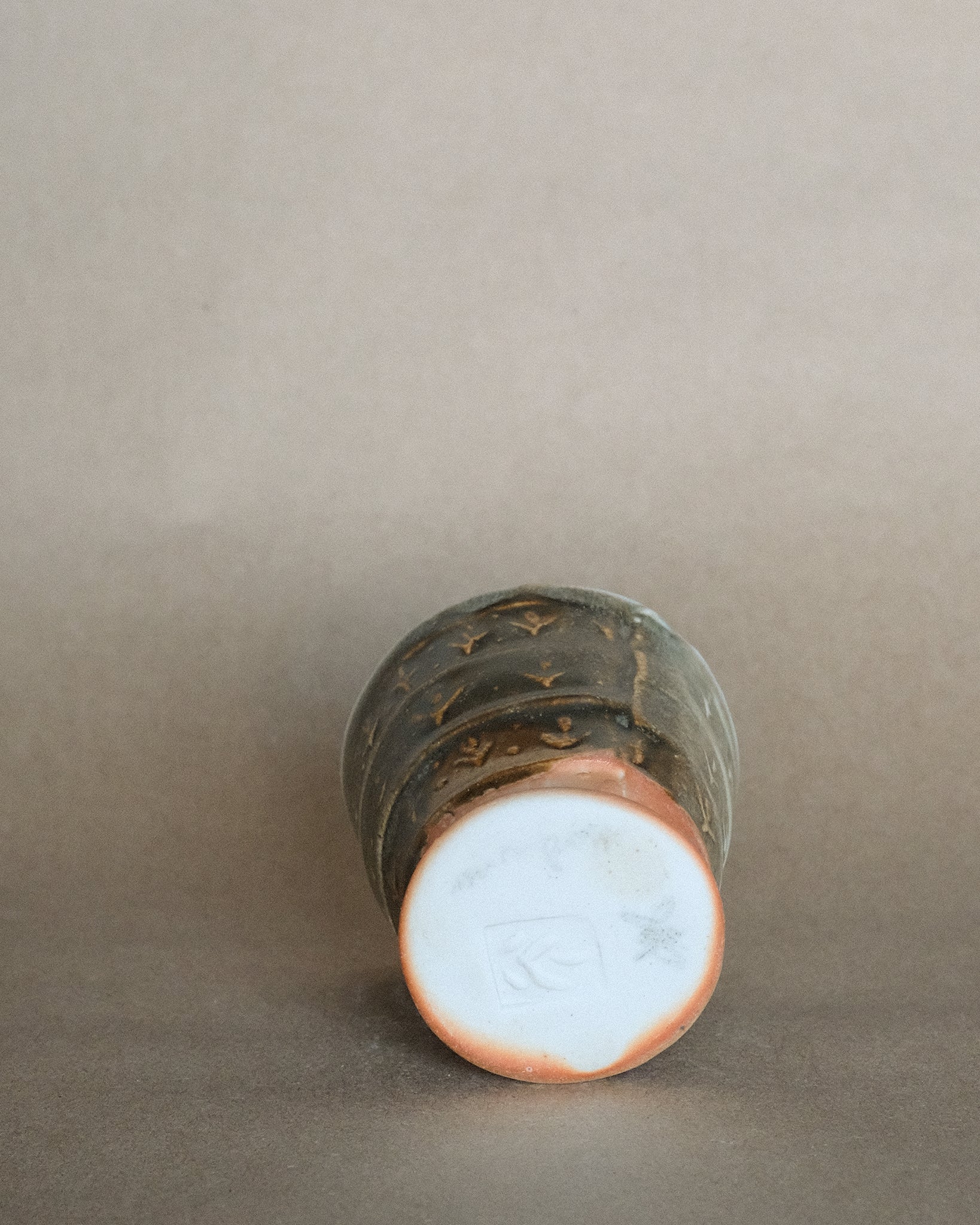porcelain, little leaf stamp motif. Satin temmoku glaze that varies between a coppery finish to a glossy khaki and lighter crackle geren where ash deposited on one side.